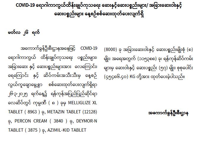 COVID-19 ရောဂါကာကွယ်ထိန်းချုပ် ကုသရေး ဆေးနှင့်ဆေးပစ္စည်းများ နေ့စဉ်စစ်ဆေး ထုတ်ပေး လျက်ရှိ