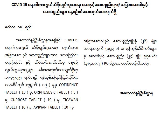 COVID-19 ရောဂါကာကွယ်ထိန်းချုပ် ကုသရေး ဆေးနှင့်ဆေးပစ္စည်းများ နေ့စဉ်စစ်ဆေး ထုတ်ပေး လျက်ရှိ