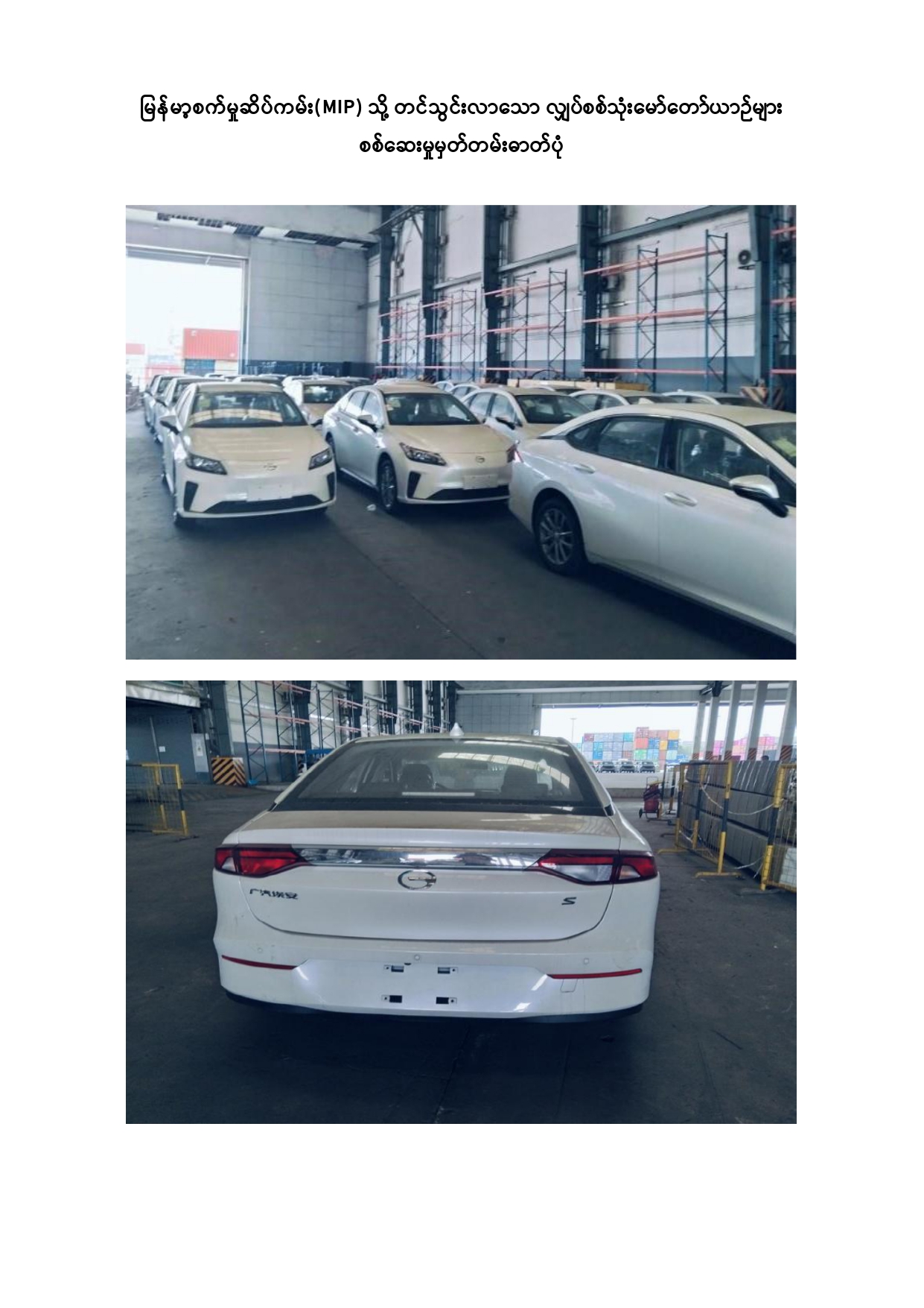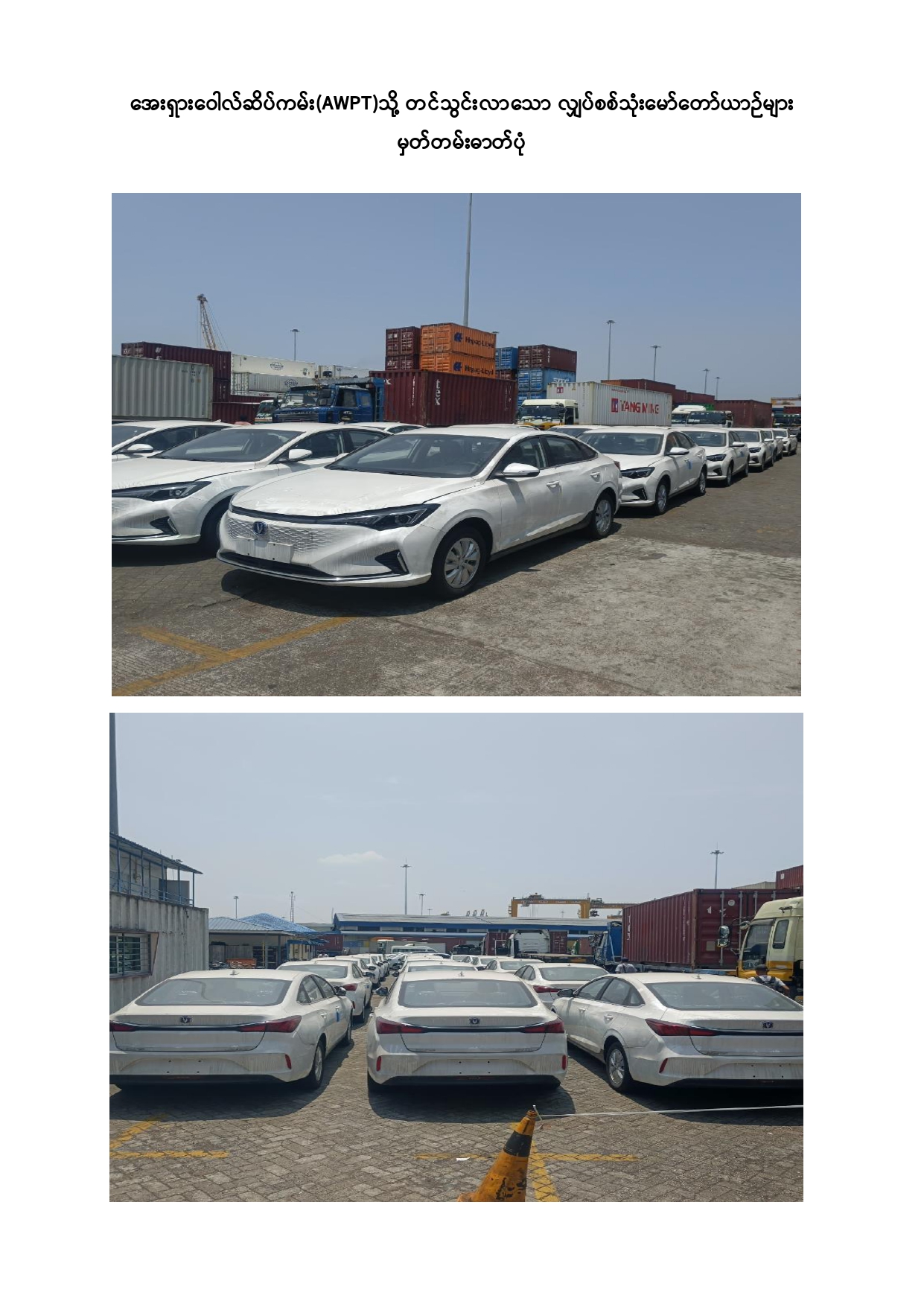 လျှပ်စစ်သုံးမော်တော်ယာဉ်များ အေးရှားဝေါလ်ဆိပ်ကမ်း (AWPT)၊ မြန်မာ့စက်မှုဆိပ်ကမ်း(MIP) နှင့် ရွာသာကြီးကုန်းတွင်းဆိပ်ကမ်း(Dry Port – RG) သို့ရောက်ရှိထုတ်ပေးခဲ့ခြင်း