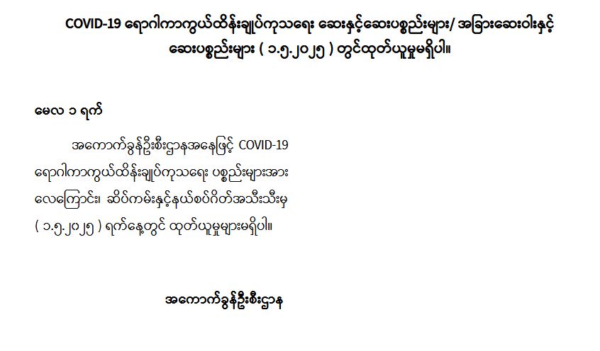 COVID-19 ရောဂါကာကွယ်ထိန်းချုပ် ကုသရေး ဆေးနှင့်ဆေးပစ္စည်းများ နေ့စဉ်စစ်ဆေး ထုတ်ပေး လျက်ရှိ