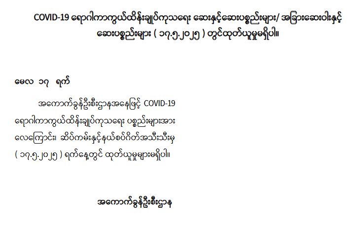 COVID-19 ရောဂါကာကွယ်ထိန်းချုပ် ကုသရေး ဆေးနှင့်ဆေးပစ္စည်းများ နေ့စဉ်စစ်ဆေး ထုတ်ပေး လျက်ရှိ