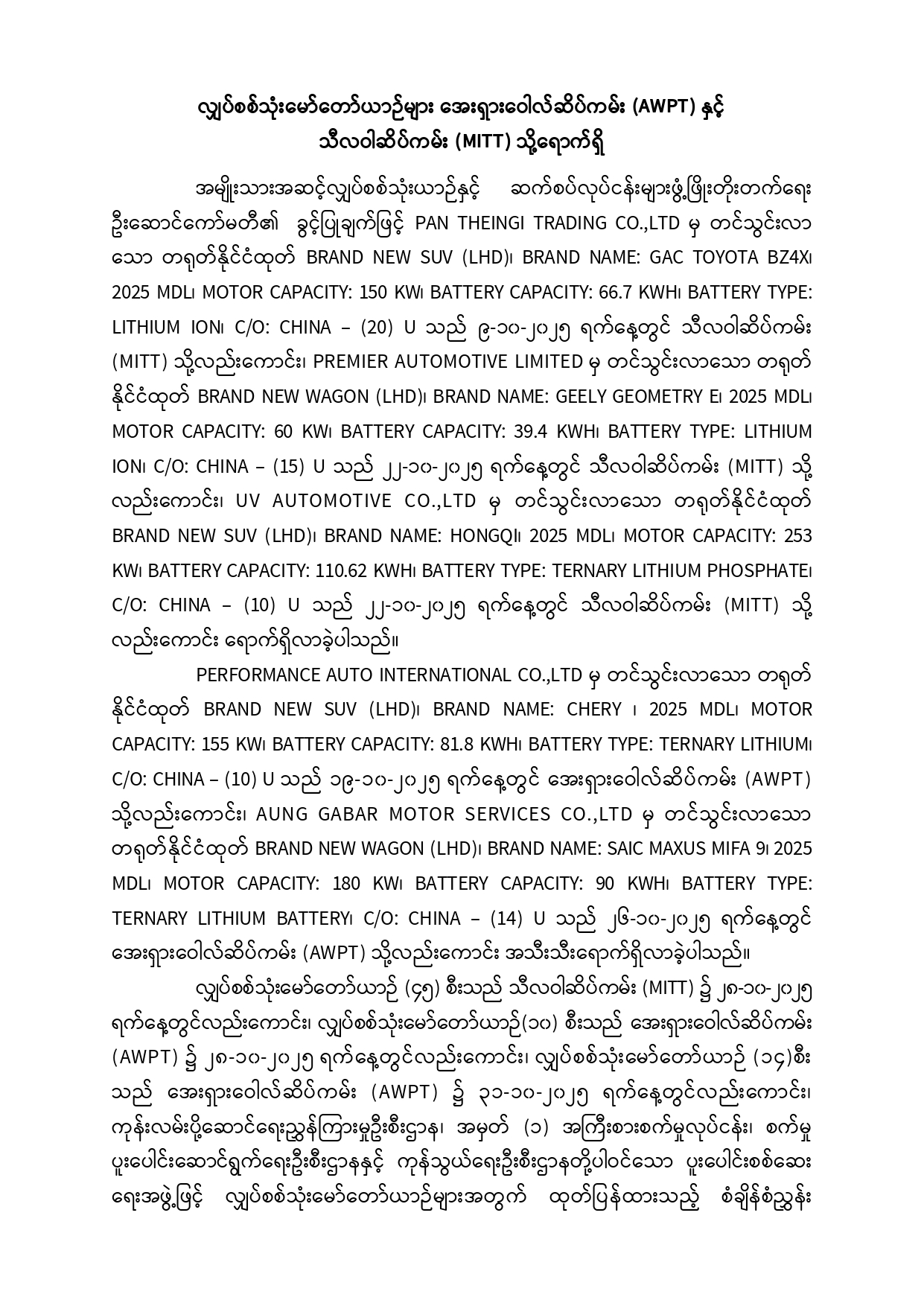 လျှပ်စစ်သုံးမော်တော်ယာဉ်များ အေးရှားဝေါလ်ဆိပ်ကမ်း (AWPT) နှင့် သီလဝါဆိပ်ကမ်း (MITT) သို့ရောက်ရှိထုတ်ပေးခဲ့ခြင်း