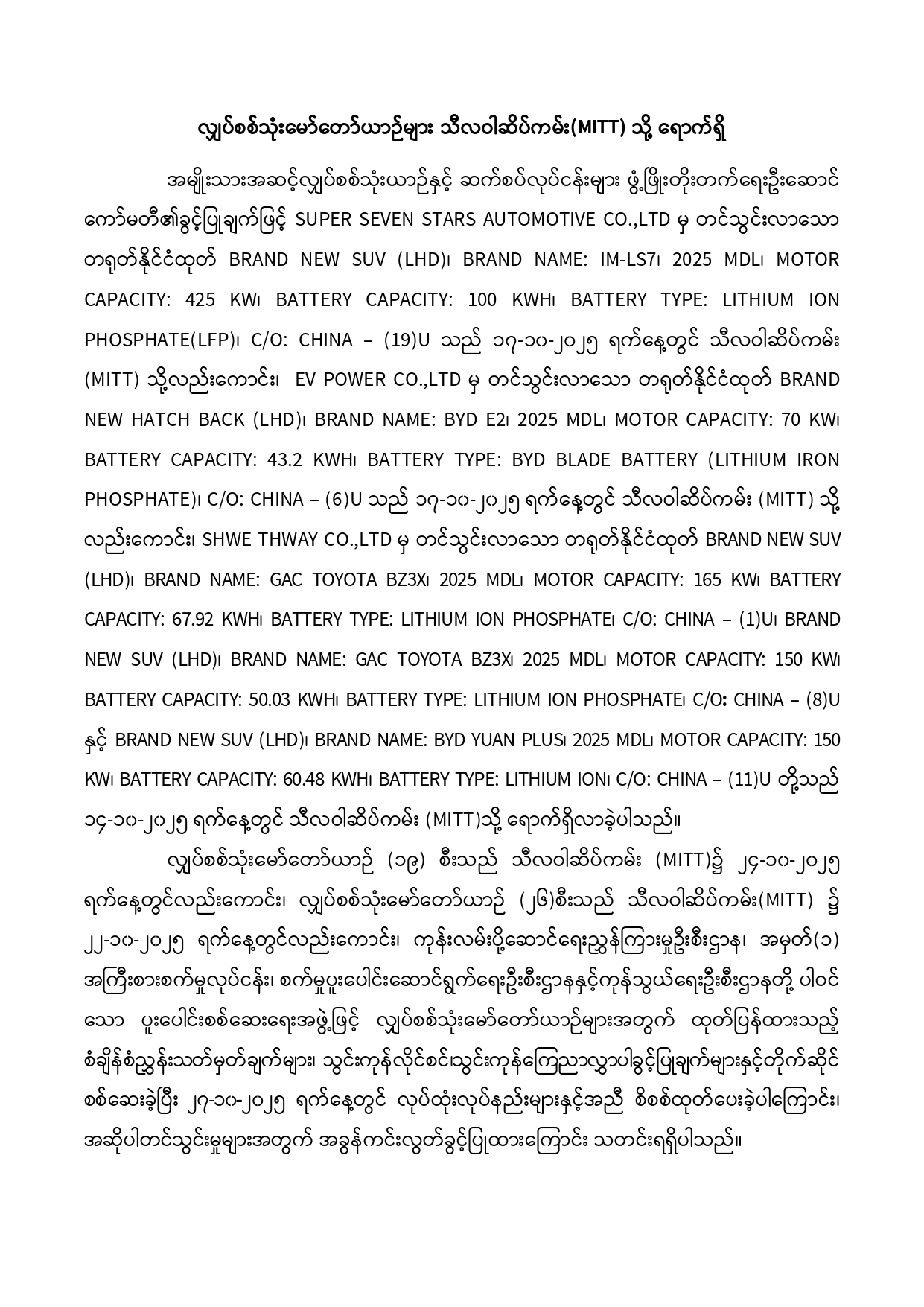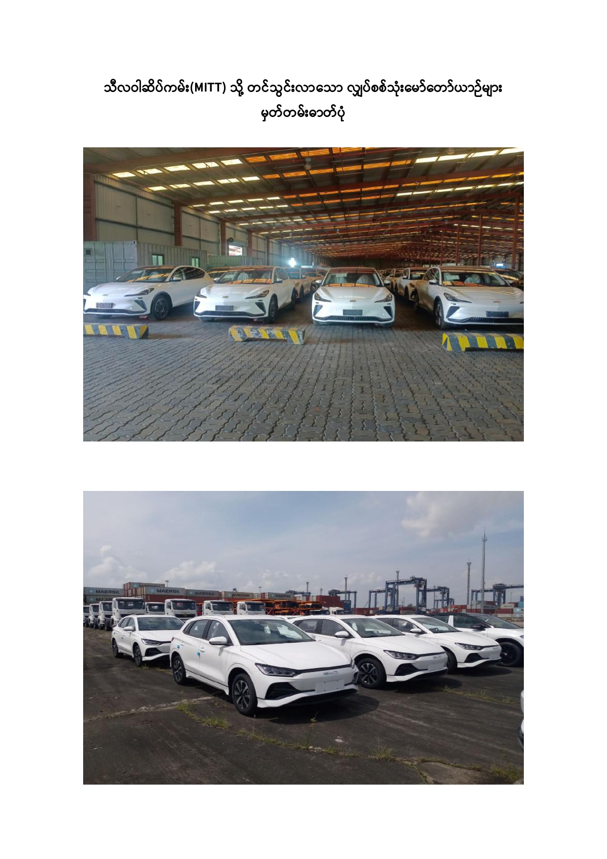 လျှပ်စစ်သုံးမော်တော်ယာဉ်များ သီလဝါဆိပ်ကမ်း(MITT) သို့ ရောက်ရှိထုတ်ပေးခဲ့ခြင်း