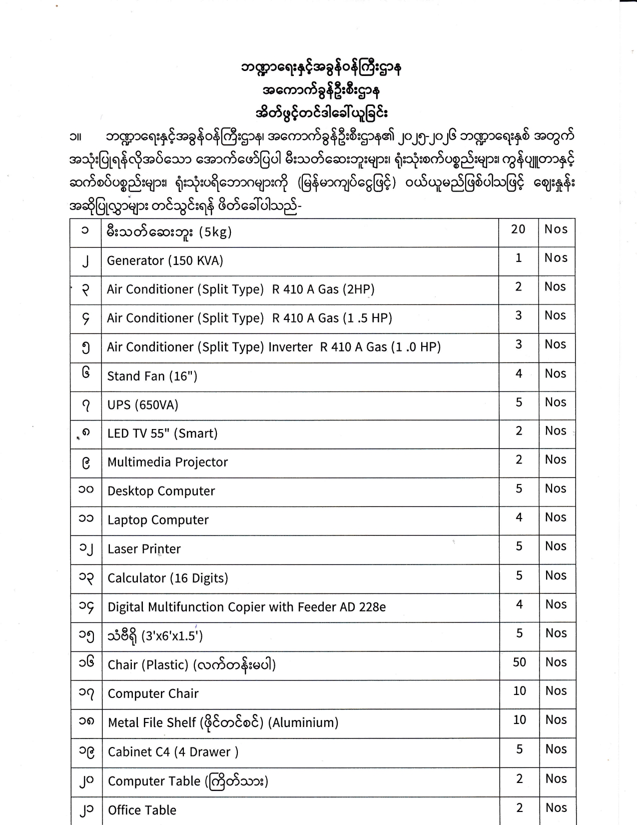 အကောက်ခွန်ဦးစီးဌာနအတွက် အသုံးပြုရန်လိုအပ်သော မီးသတ်ဆေးဘူး၊ ရုံးသုံးစက်ပစ္စည်းများ၊ ကွန်ပျူတာနှင့်ဆက်စပ်ပစ္စည်းများ၊ရုံးသုံးပရိဘောဂများကို အိတ်ဖွင့်တင်ဒါခေါ်ယူခြင်း
