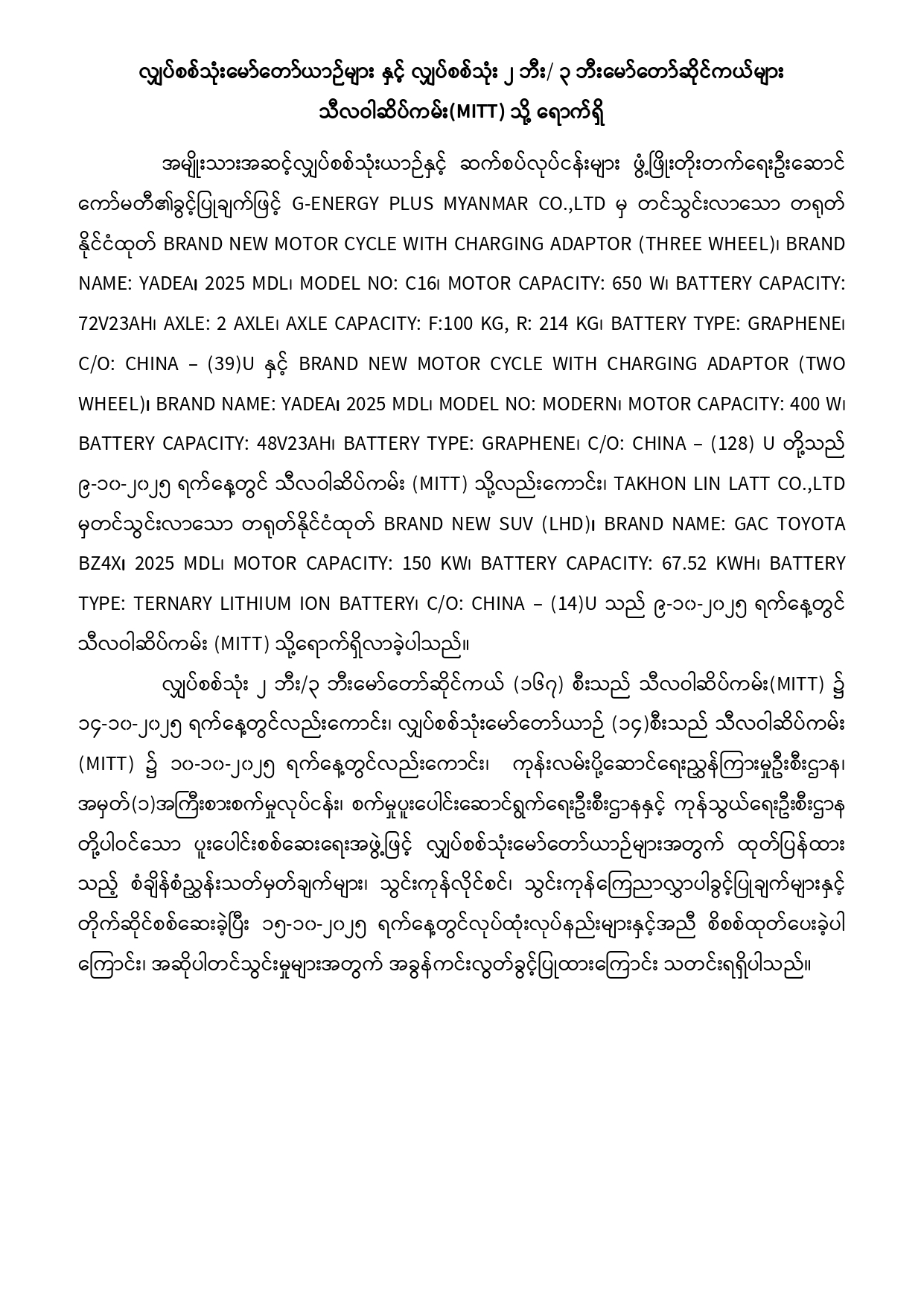 လျှပ်စစ်သုံးမော်တော်ယာဉ်များ နှင့် လျှပ်စစ်သုံး ၂ ဘီး/ ၃ ဘီးမော်တော်ဆိုင်ကယ်များ သီလဝါဆိပ်ကမ်း(MITT) သို့ ရောက်ရှိထုတ်ပေးခဲ့ခြင်း