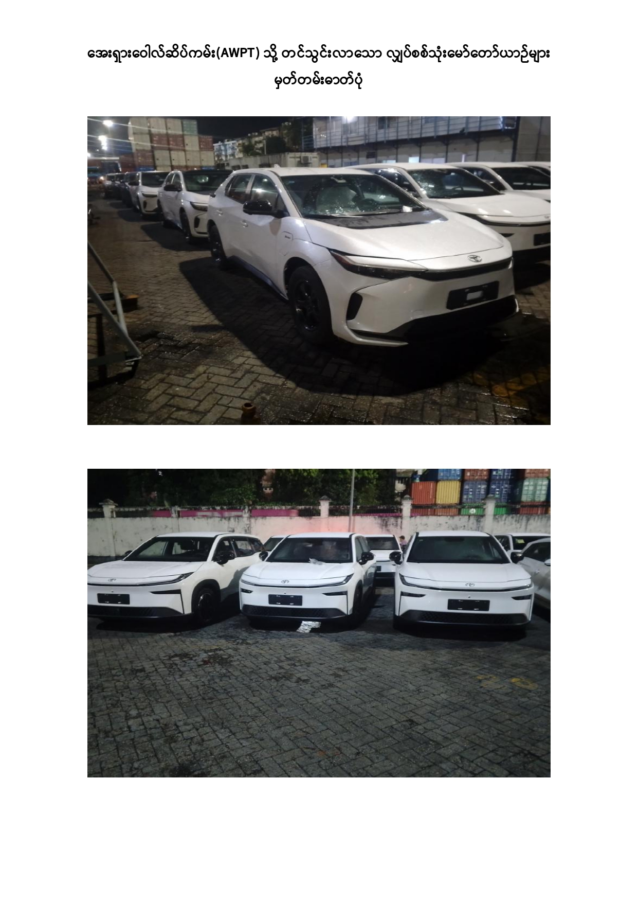 လျှပ်စစ်သုံးမော်တော်ယာဉ်များ အေးရှားဝေါလ်ဆိပ်ကမ်း(AWPT) သို့ ရောက်ရှိထုတ်ပေးခဲ့ခြင်း
