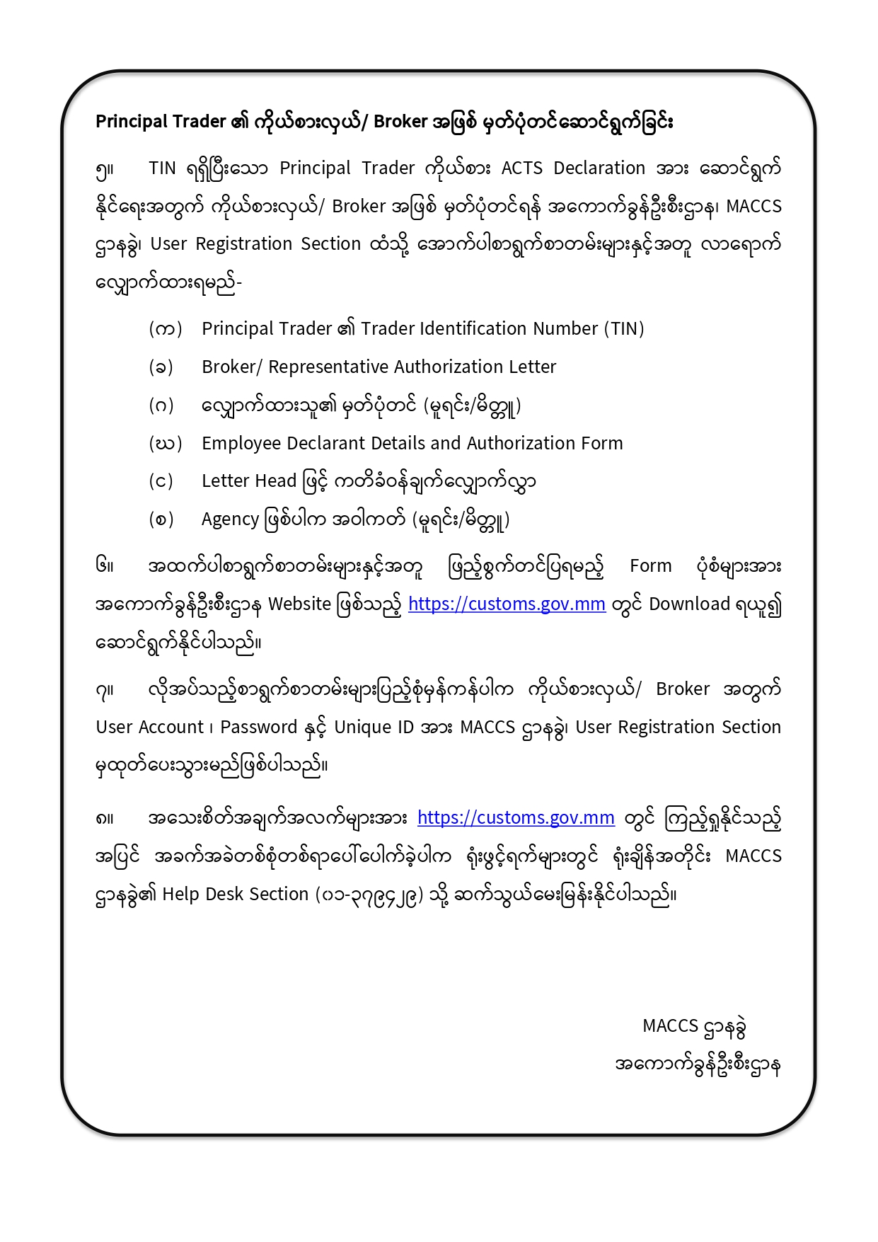 အကောက်ခွန်ဦးစီးဌာန၊ MACCS ဌာနခွဲ၏ကြေညာချက် (၀၁၂/ ၂၀၂၅)
