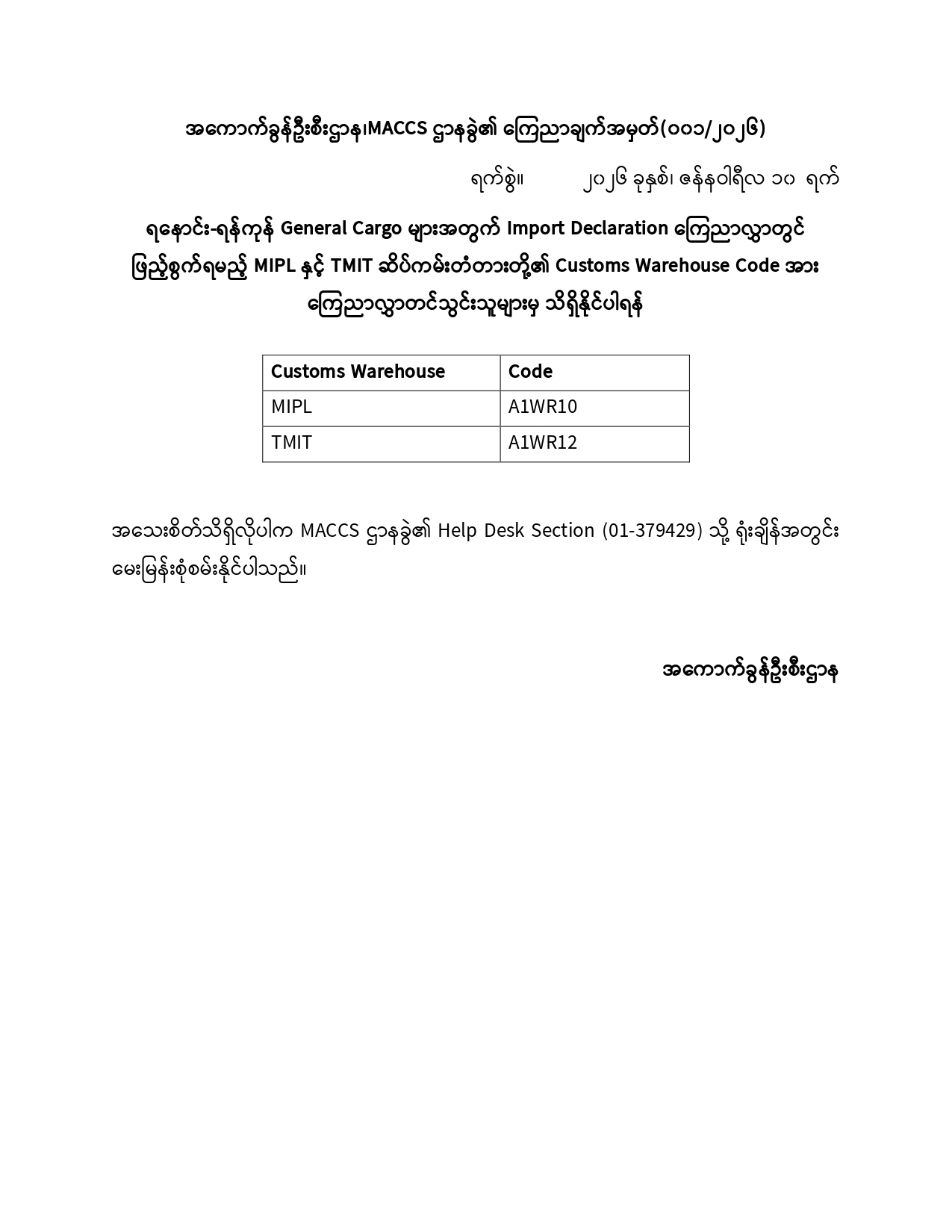 ရနောင်-ရန်ကုန် ကုန်ပစ္စည်းများအတွက် Without Cargo Information Import Declaration ကြေညာလွှာတွင် ဖြည့်စွက်ရမည့် MIP, Shwe Me ဆိပ်ကမ်းတံတားတို့၏ Customs Warehouse Code အား ကြေညာလွှာတင်သွင်းသူများမှ သိရှိနိုင်ရန်