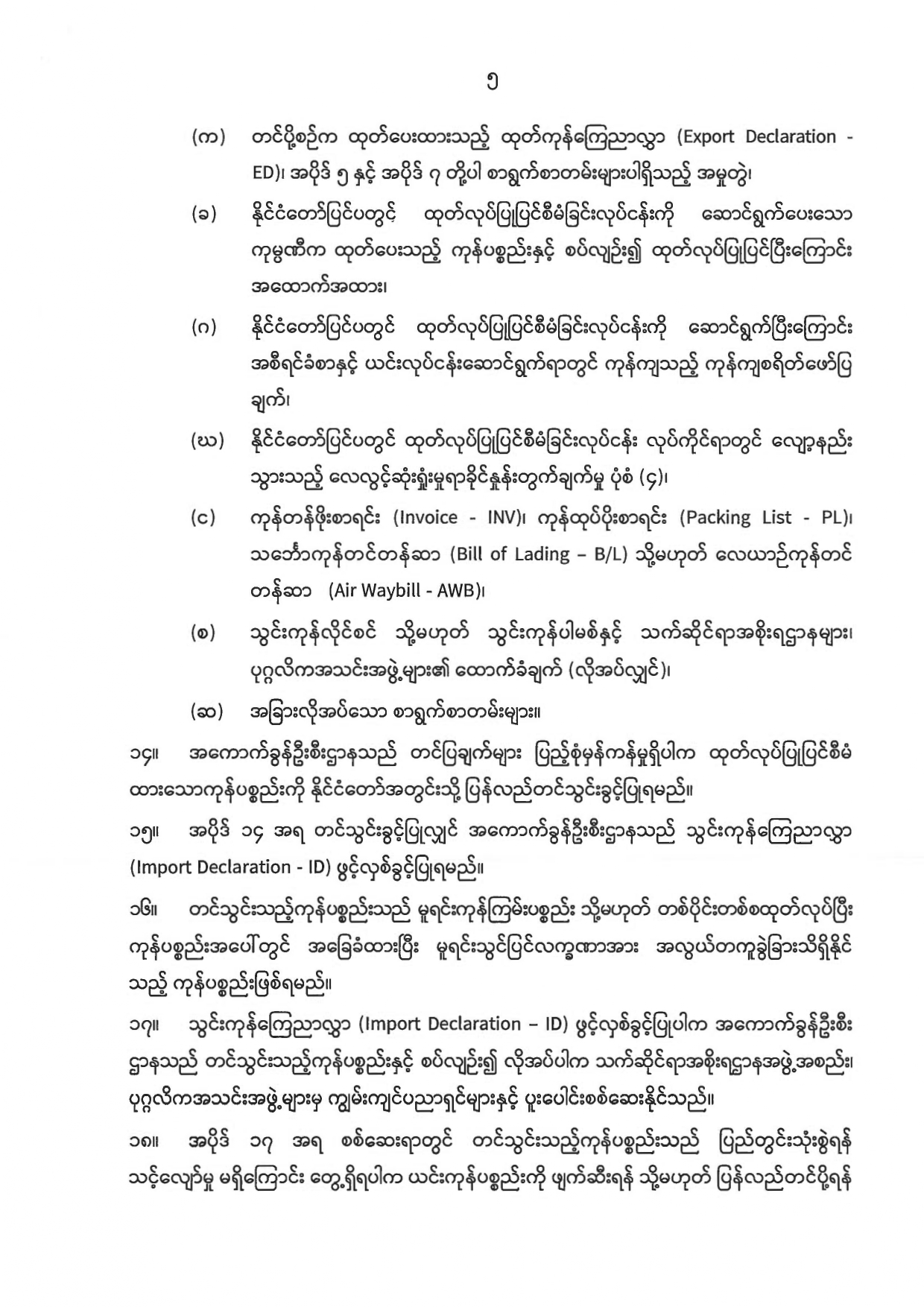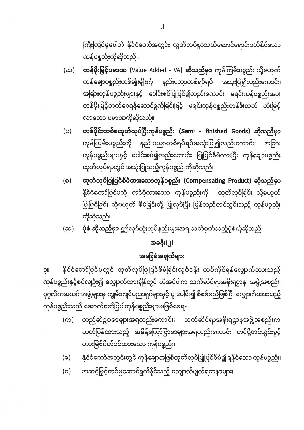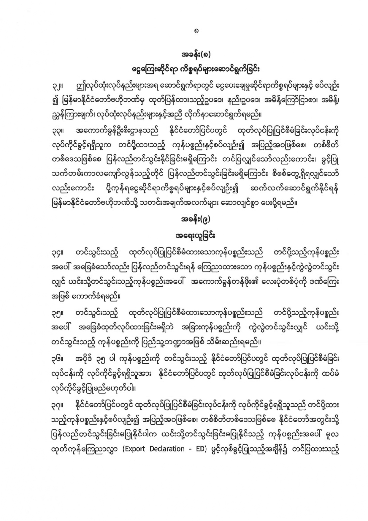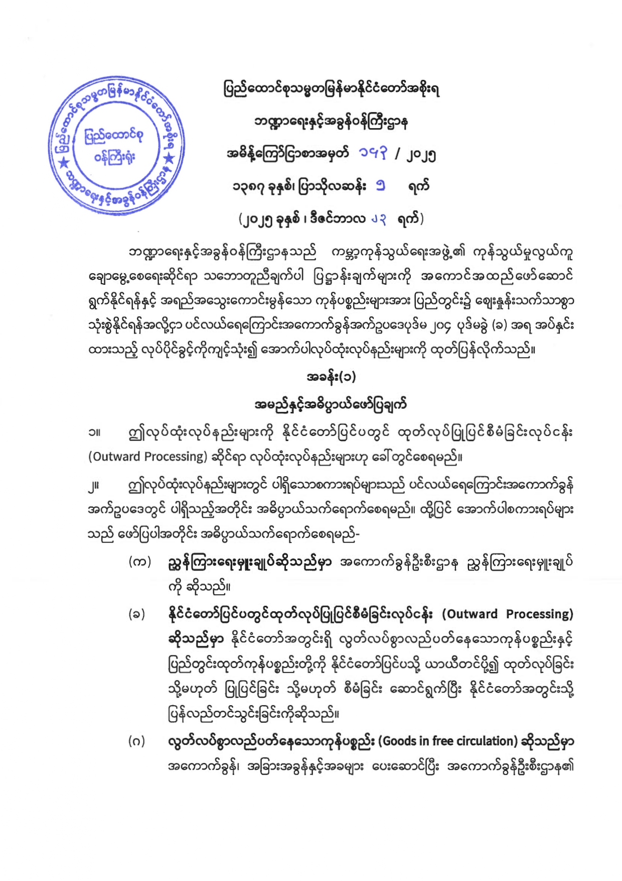 အမိန့်ကြော်ငြာစာအမှတ် (၁၄၃/၂၀၂၅) - နိုင်ငံတော်ပြင်ပတွင် ထုတ်လုပ်ပြုပြင်စီမံခြင်းလုပ်ငန်း(Outward Processing) ဆိုင်ရာလုပ်ထုံးလုပ်နည်းများ