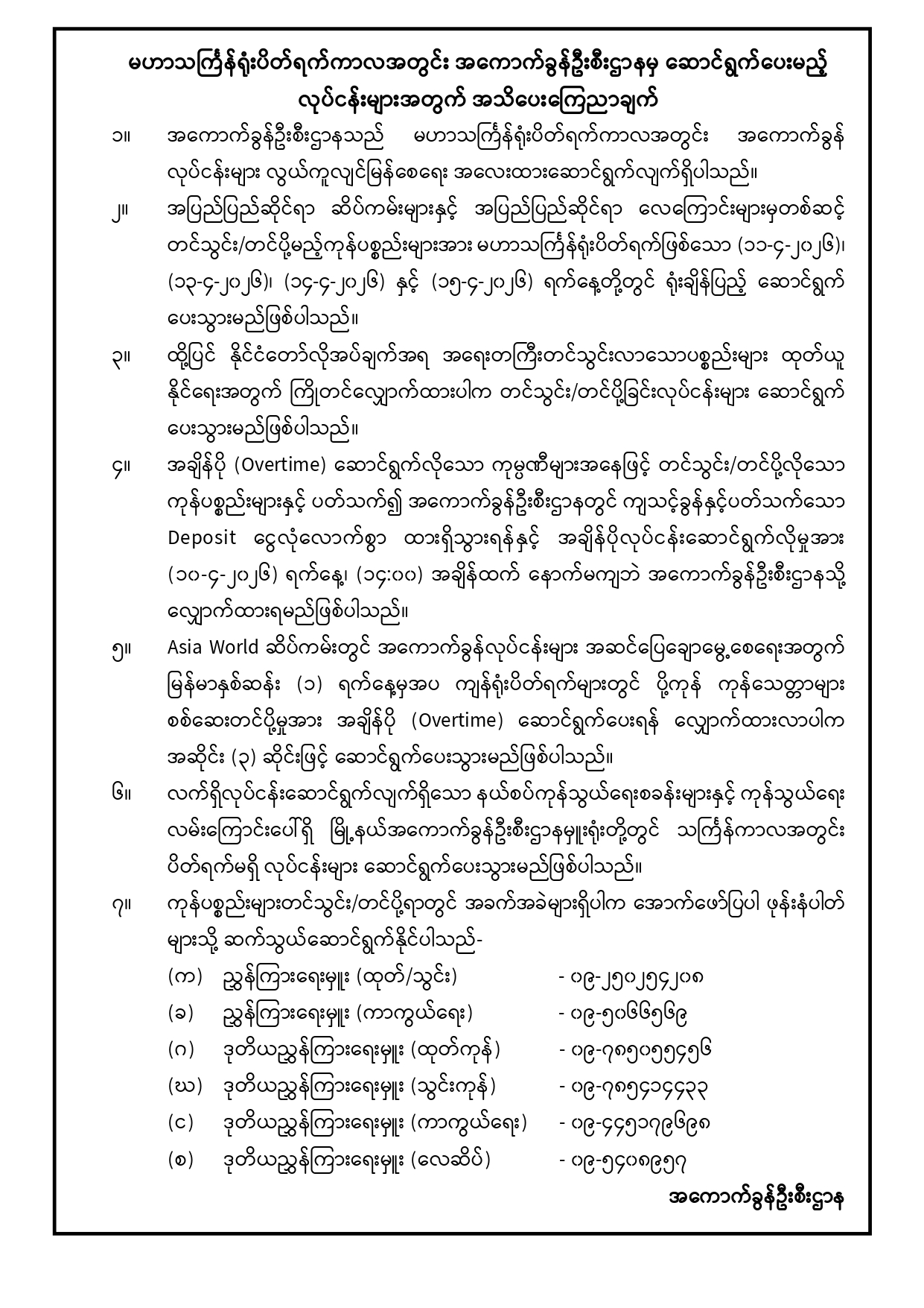 မဟာသင်္ကြန်ရုံးပိတ်ရက်ကာလအတွင်း အကောက်ခွန်ဦးစီးဌာနမှ ဆောင်ရွက်ပေးမည့် လုပ်ငန်းများအတွက် အသိပေးကြေညာချက်