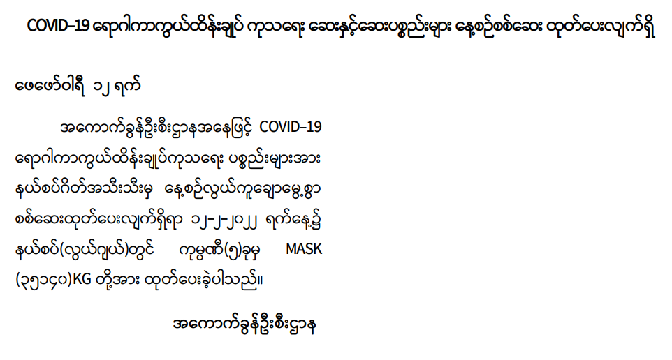 COVID-19 ရောဂါကာကွယ်ထိန်းချုပ် ကုသရေး ဆေးနှင့်ဆေးပစ္စည်းများ နေ့စဉ်စစ်ဆေး ထုတ်ပေး လျက်ရှိ