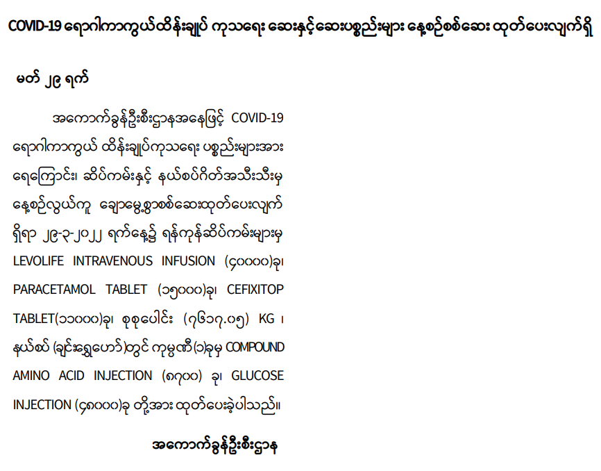 COVID-19 ရောဂါကာကွယ်ထိန်းချုပ် ကုသရေး ဆေးနှင့်ဆေးပစ္စည်းများ နေ့စဉ်စစ်ဆေး ထုတ်ပေး လျက်ရှိ