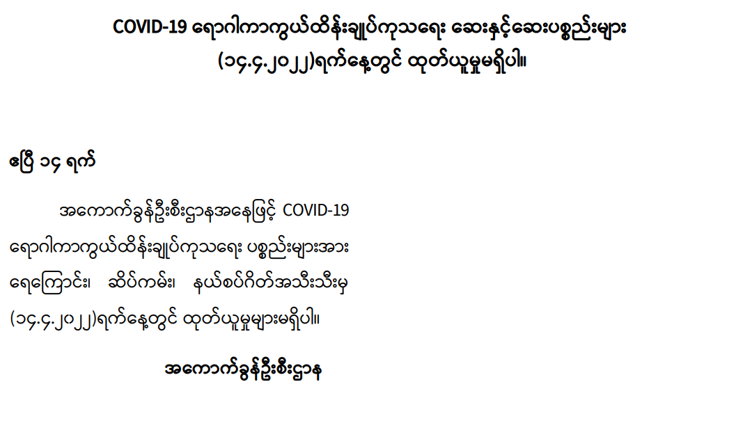 COVID-19 ရောဂါကာကွယ်ထိန်းချုပ် ကုသရေး ဆေးနှင့်ဆေးပစ္စည်းများ နေ့စဉ်စစ်ဆေး ထုတ်ပေး လျက်ရှိ