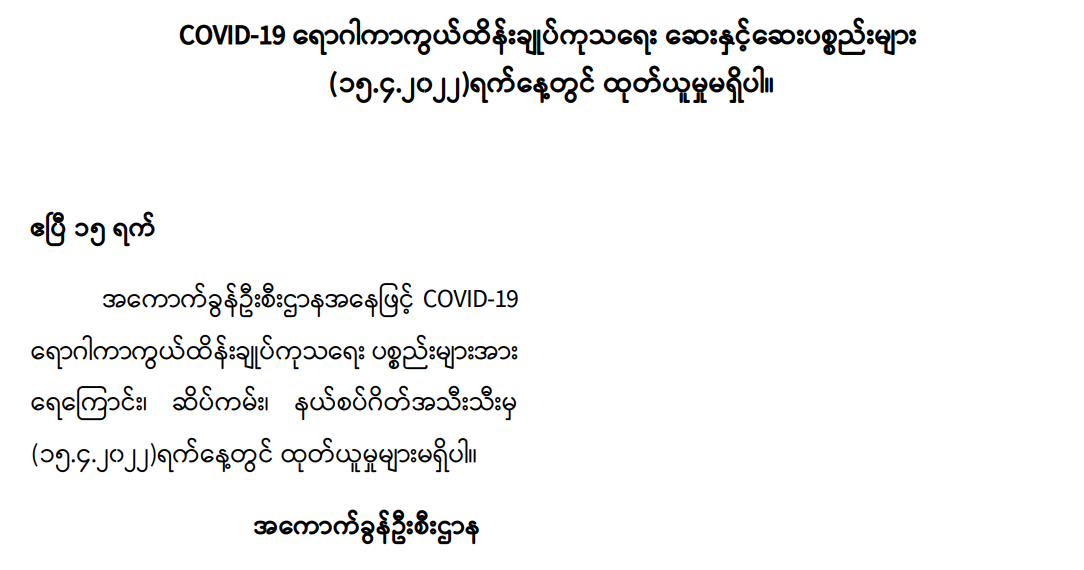 COVID-19 ရောဂါကာကွယ်ထိန်းချုပ် ကုသရေး ဆေးနှင့်ဆေးပစ္စည်းများ နေ့စဉ်စစ်ဆေး ထုတ်ပေး လျက်ရှိ