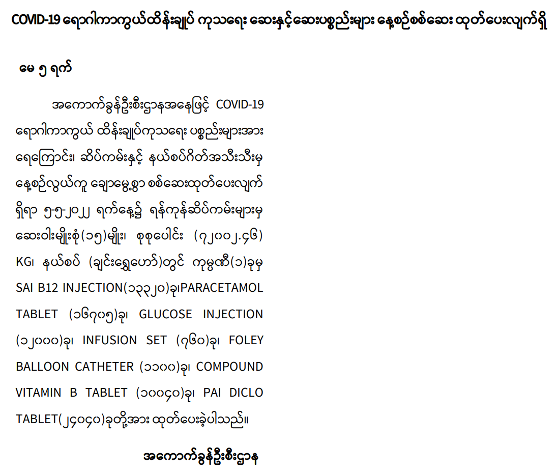 COVID-19 ရောဂါကာကွယ်ထိန်းချုပ် ကုသရေး ဆေးနှင့်ဆေးပစ္စည်းများ နေ့စဉ်စစ်ဆေး ထုတ်ပေး လျက်ရှိ