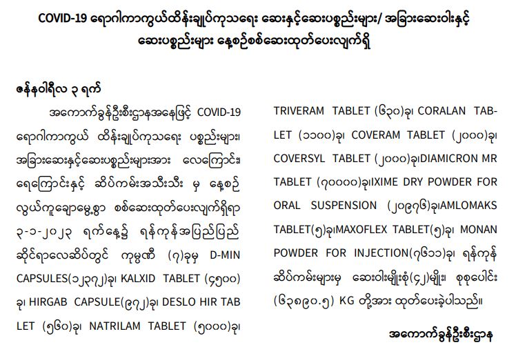 COVID-19 ရောဂါကာကွယ်ထိန်းချုပ် ကုသရေး ဆေးနှင့်ဆေးပစ္စည်းများ နေ့စဉ်စစ်ဆေး ထုတ်ပေး လျက်ရှိ
