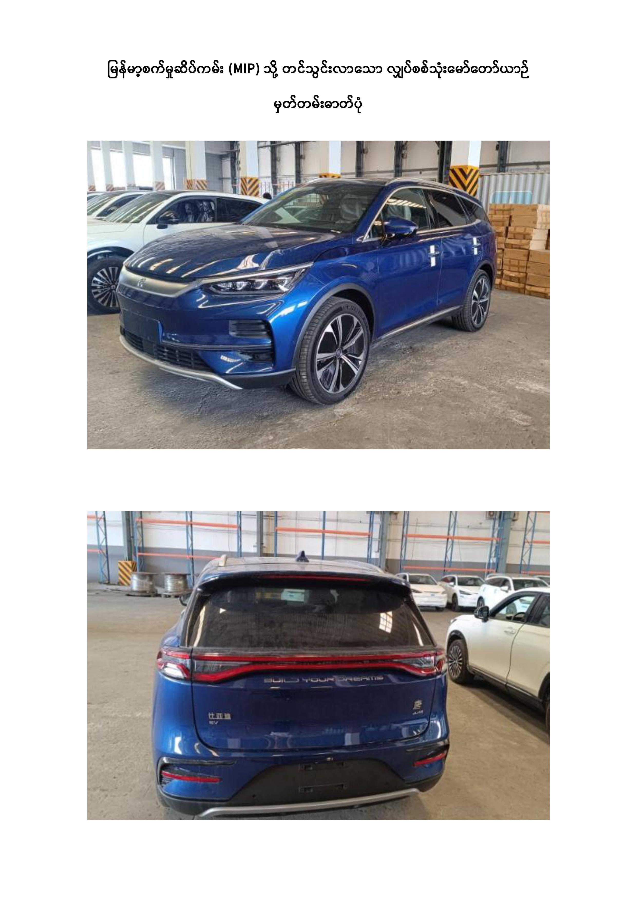 လျှပ်စစ်သုံးမော်တော်ယာဉ်များ မြန်မာ့စက်မှုဆိပ်ကမ်း (MIP) သို့ ရောက်ရှိထုတ်ပေးခဲ့ခြင်း