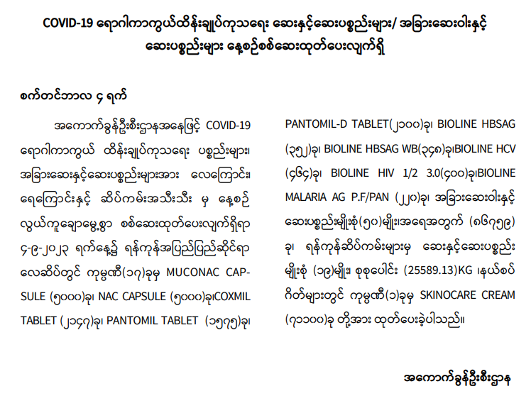 COVID-19 ရောဂါကာကွယ်ထိန်းချုပ် ကုသရေး ဆေးနှင့်ဆေးပစ္စည်းများ နေ့စဉ်စစ်ဆေး ထုတ်ပေး လျက်ရှိ