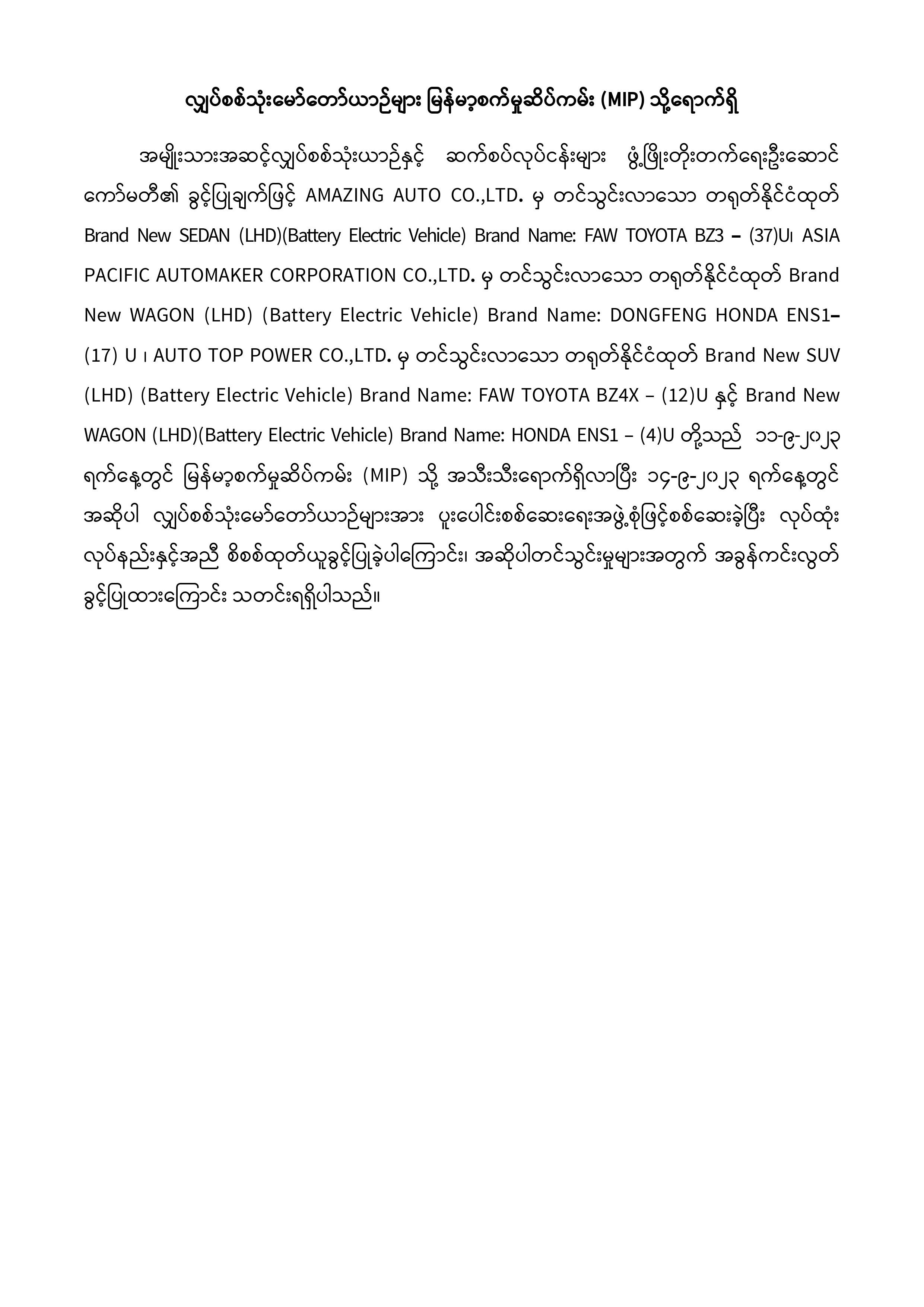လျှပ်စစ်သုံးမော်တော်ယာဉ်များ မြန်မာ့စက်မှုဆိပ်ကမ်း (MIP) သို့ရောက်ရှိထုတ်ပေးခဲ့ခြင်း