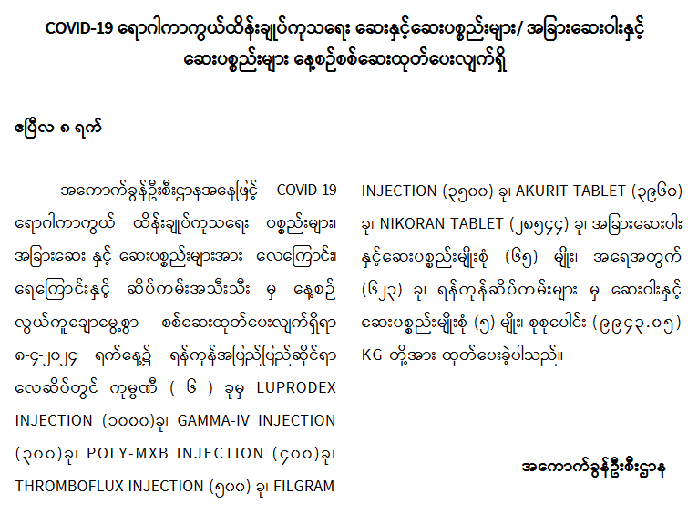 COVID-19 ရောဂါကာကွယ်ထိန်းချုပ် ကုသရေး ဆေးနှင့်ဆေးပစ္စည်းများ နေ့စဉ်စစ်ဆေး ထုတ်ပေး လျက်ရှိ