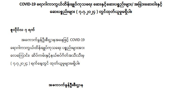 COVID-19 ရောဂါကာကွယ်ထိန်းချုပ် ကုသရေး ဆေးနှင့်ဆေးပစ္စည်းများ နေ့စဉ်စစ်ဆေး ထုတ်ပေး လျက်ရှိ