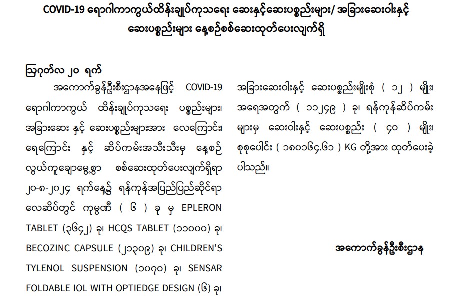 COVID-19 ရောဂါကာကွယ်ထိန်းချုပ် ကုသရေး ဆေးနှင့်ဆေးပစ္စည်းများ နေ့စဉ်စစ်ဆေး ထုတ်ပေး လျက်ရှိ
