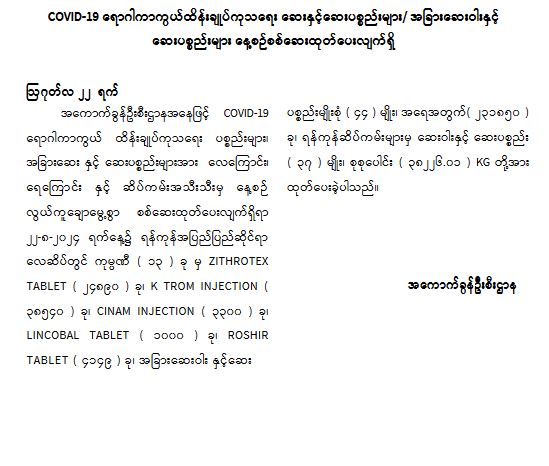 COVID-19 ရောဂါကာကွယ်ထိန်းချုပ် ကုသရေး ဆေးနှင့်ဆေးပစ္စည်းများ နေ့စဉ်စစ်ဆေး ထုတ်ပေး လျက်ရှိ