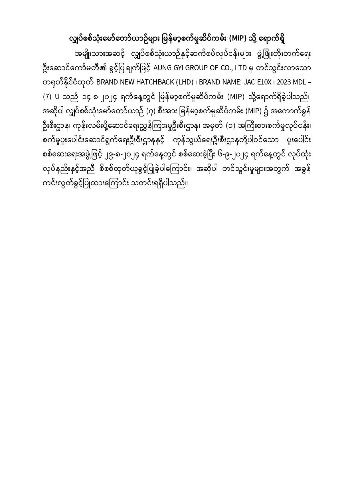 လျှပ်စစ်သုံးမော်တော်ယာဉ်များ မြန်မာ့စက်မှုဆိပ်ကမ်း (MIP) သို့ ရောက်ရှိထုတ်ပေးခဲ့ခြင်း