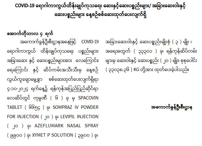 COVID-19 ရောဂါကာကွယ်ထိန်းချုပ် ကုသရေး ဆေးနှင့်ဆေးပစ္စည်းများ နေ့စဉ်စစ်ဆေး ထုတ်ပေး လျက်ရှိ