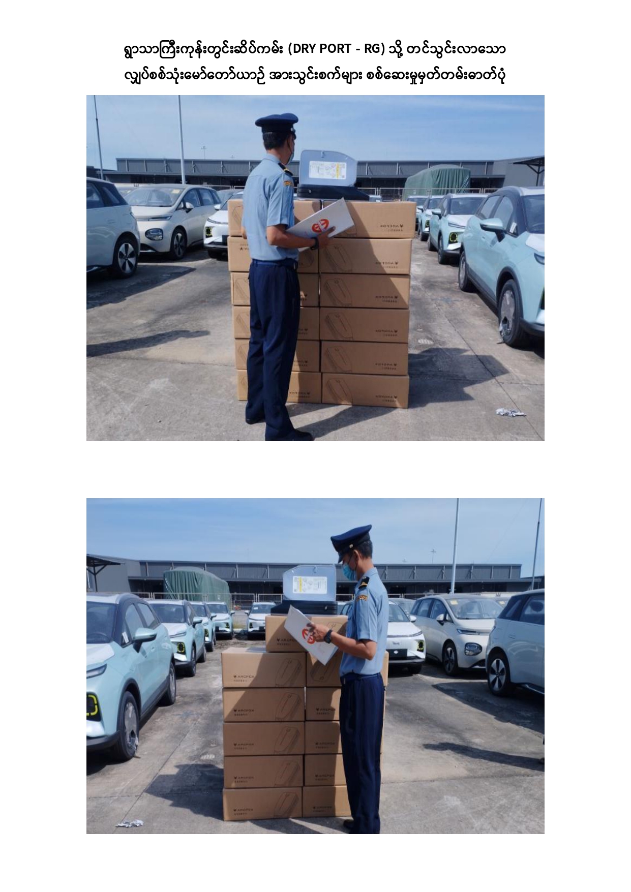 လျှပ်စစ်သုံးမော်တော်ယာဉ်များနှင့် လျှပ်စစ်သုံးမော်တော်ယာဉ် အားသွင်းစက်များ ရွာသာကြီးကုန်းတွင်းဆိပ်ကမ်း (Dry Port – RG) နှင့် မြန်မာ့စက်မှုဆိပ်ကမ်း (MIP) သို့ ရောက်ရှိ