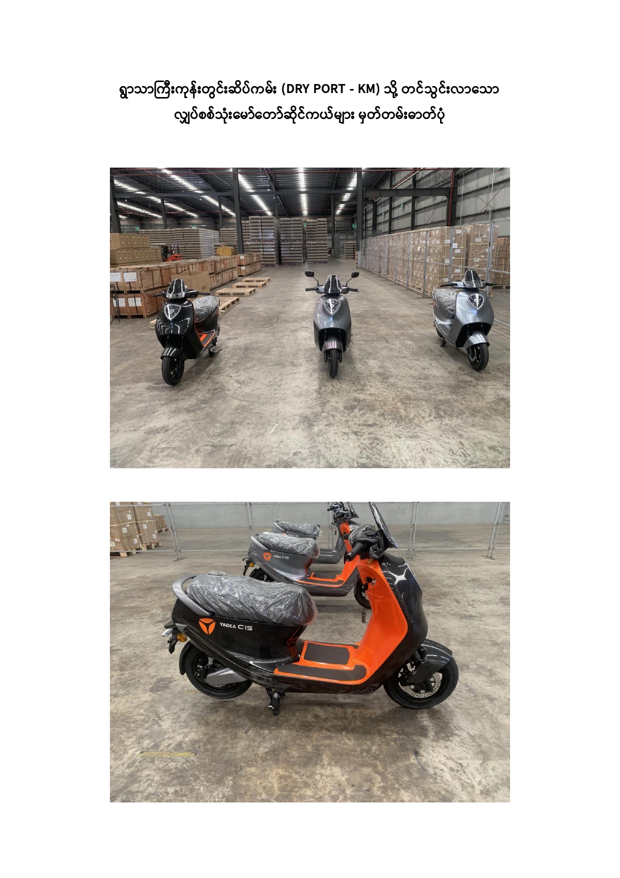 လျှပ်စစ်သုံးမော်တော်ဆိုင်ကယ်များ ရွာသာကြီးကုန်းတွင်းဆိပ်ကမ်း (Dry Port – KM ) သို့ရောက်ရှိ