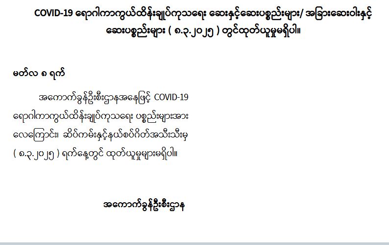 COVID-19 ရောဂါကာကွယ်ထိန်းချုပ် ကုသရေး ဆေးနှင့်ဆေးပစ္စည်းများ နေ့စဉ်စစ်ဆေး ထုတ်ပေး လျက်ရှိ
