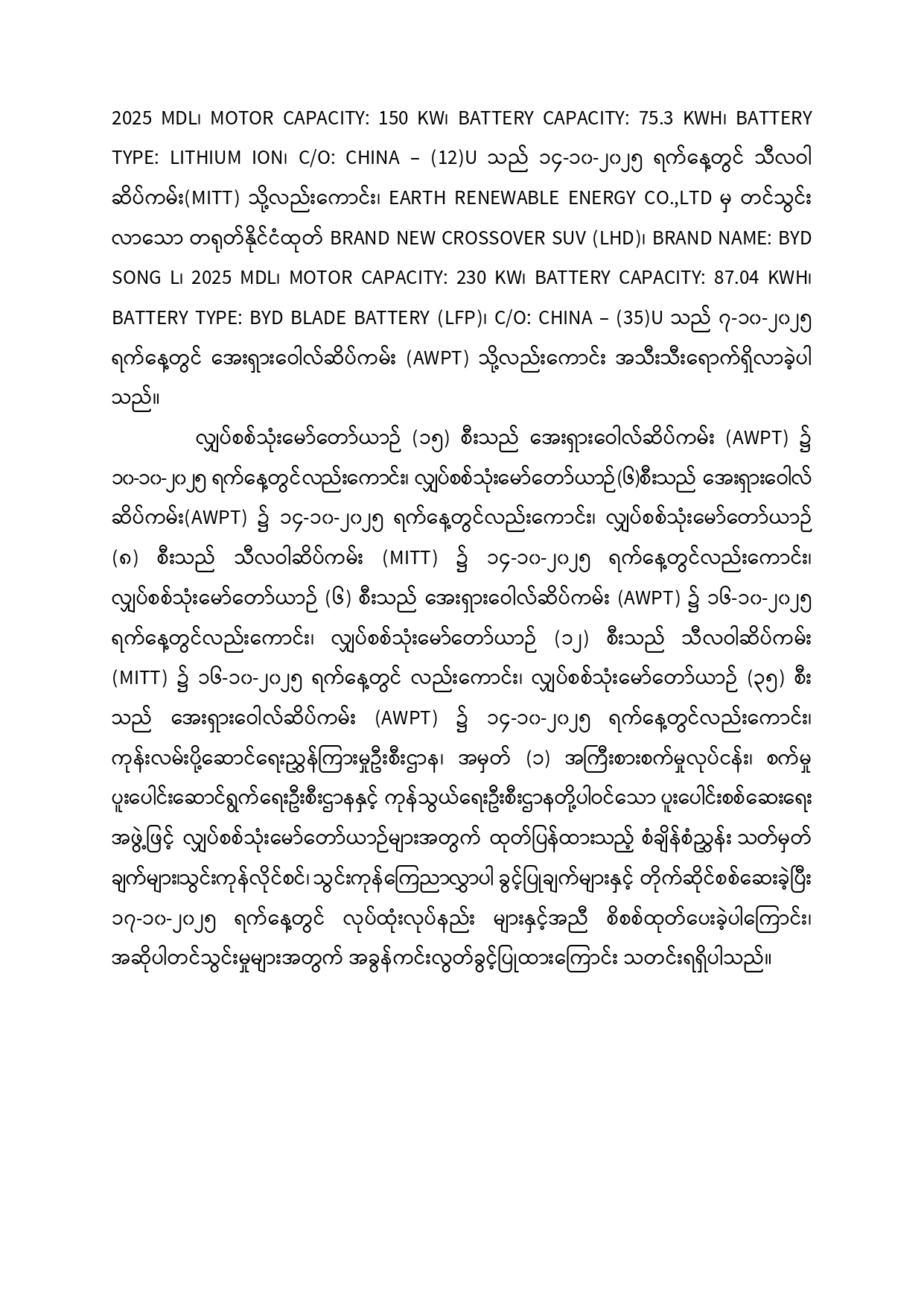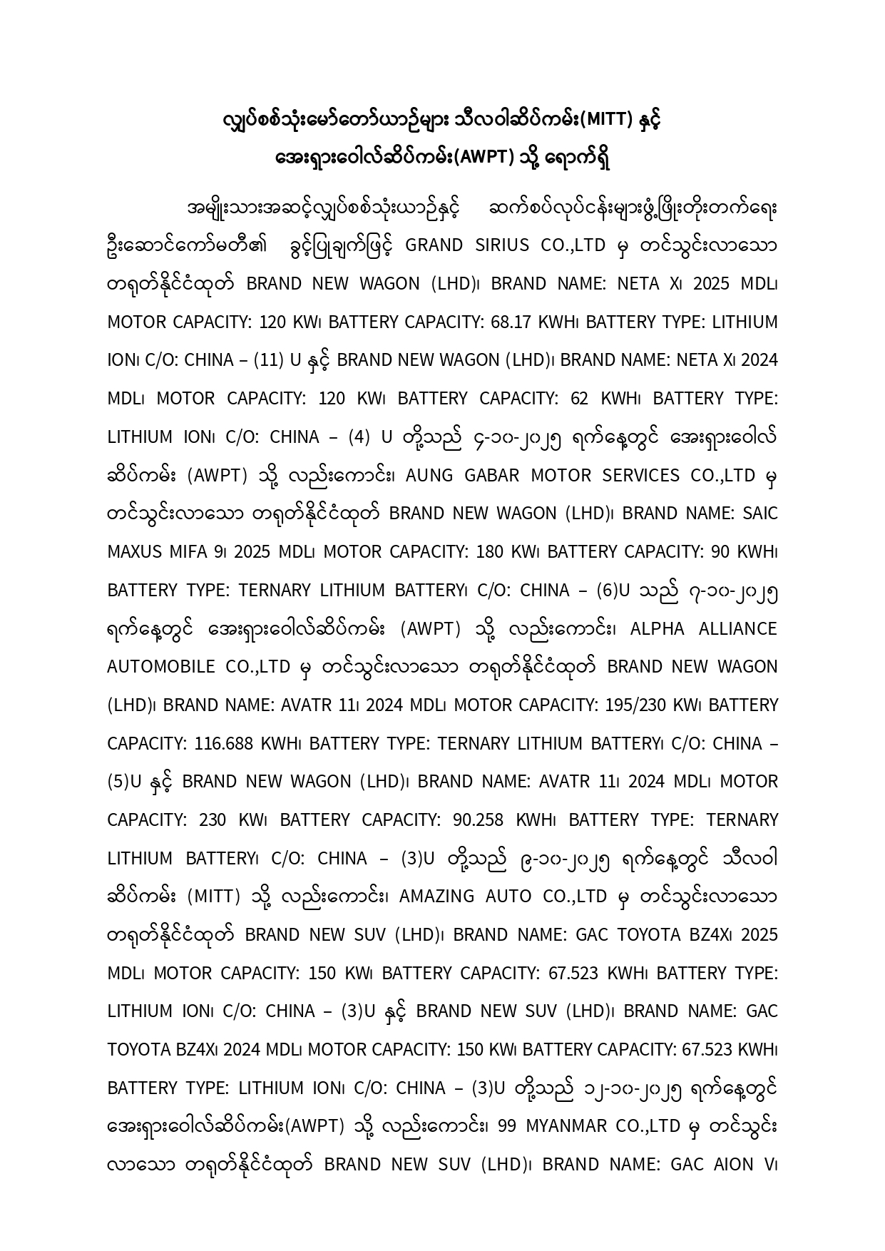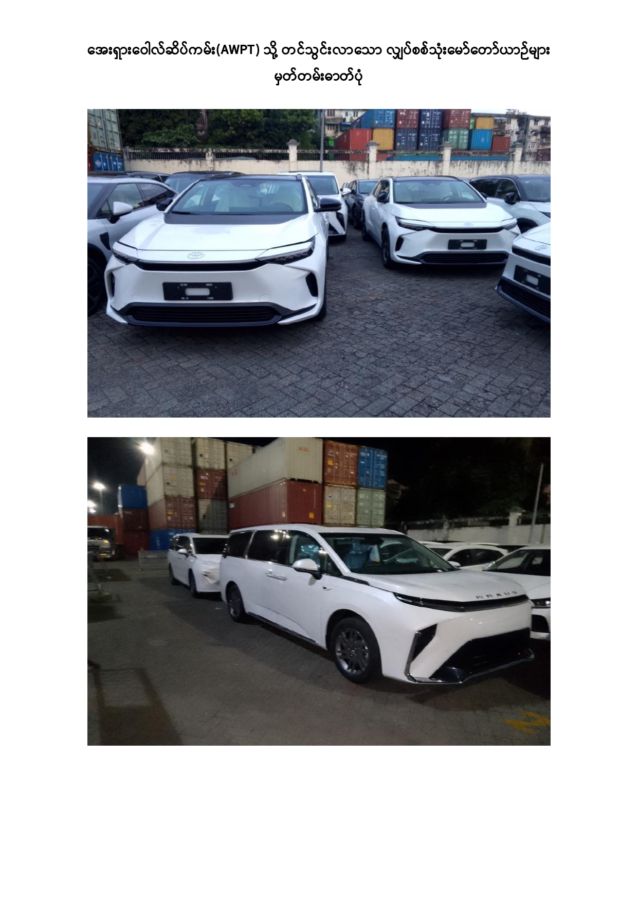 လျှပ်စစ်သုံးမော်တော်ယာဉ်များ သီလဝါဆိပ်ကမ်း (MITT) နှင့် အေးရှားဝေါလ်ဆိပ်ကမ်း(AWPT) သို့ ရောက်ရှိထုတ်ပေးခဲ့ခြင်း