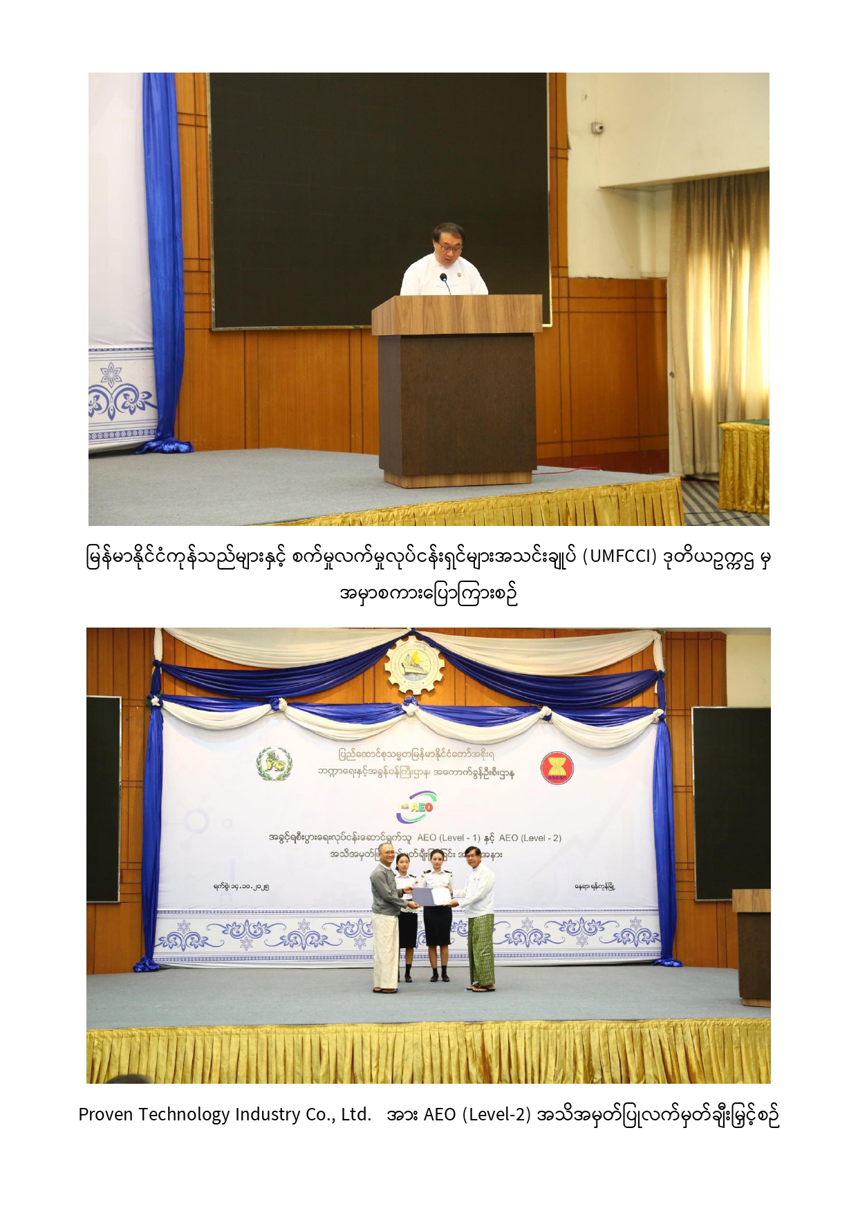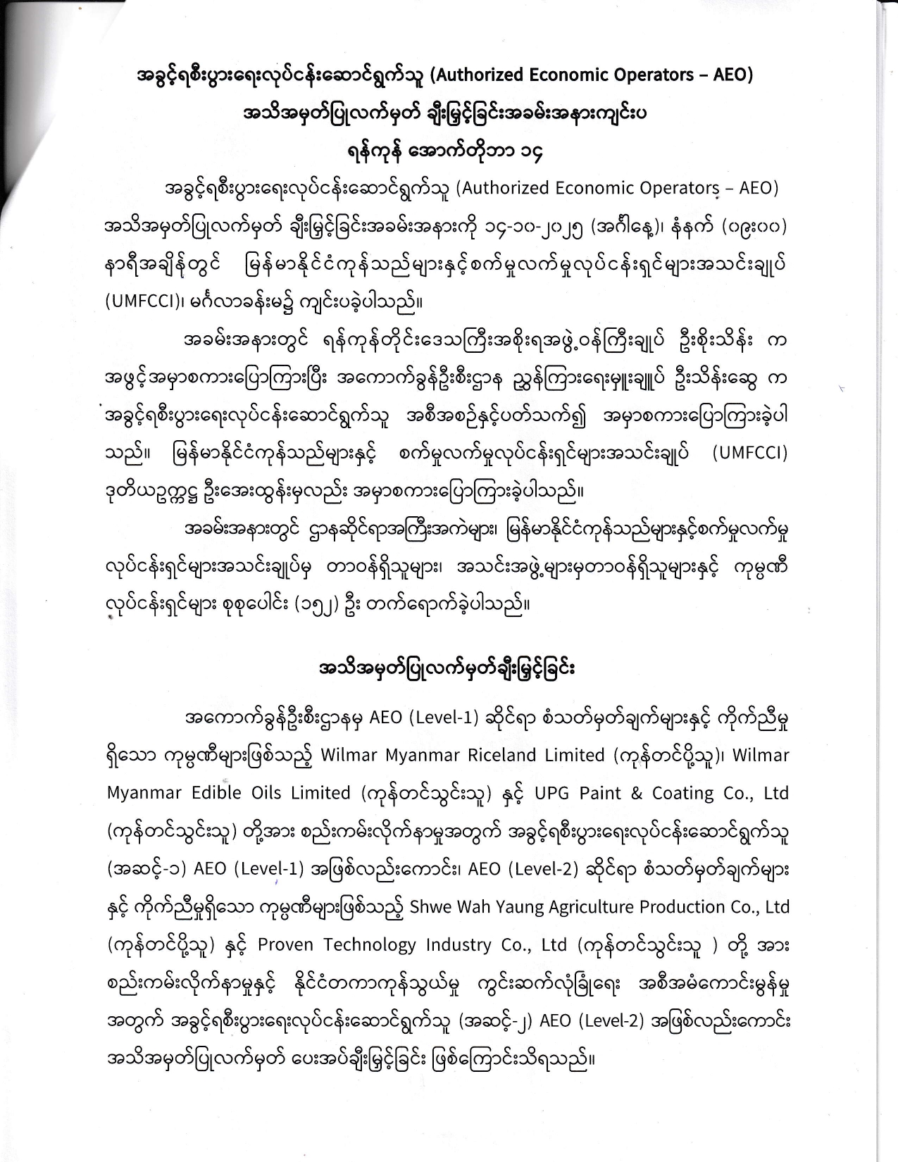 အခွင့်ရစီးပွားရေးလုပ်ငန်းဆောင်ရွက်သူ (Authorized Economic Operators – AEO)အသိအမှတ်ပြုလက်မှတ် ချီးမြှင့်ခြင်းအခမ်းအနားကျင်းပ
