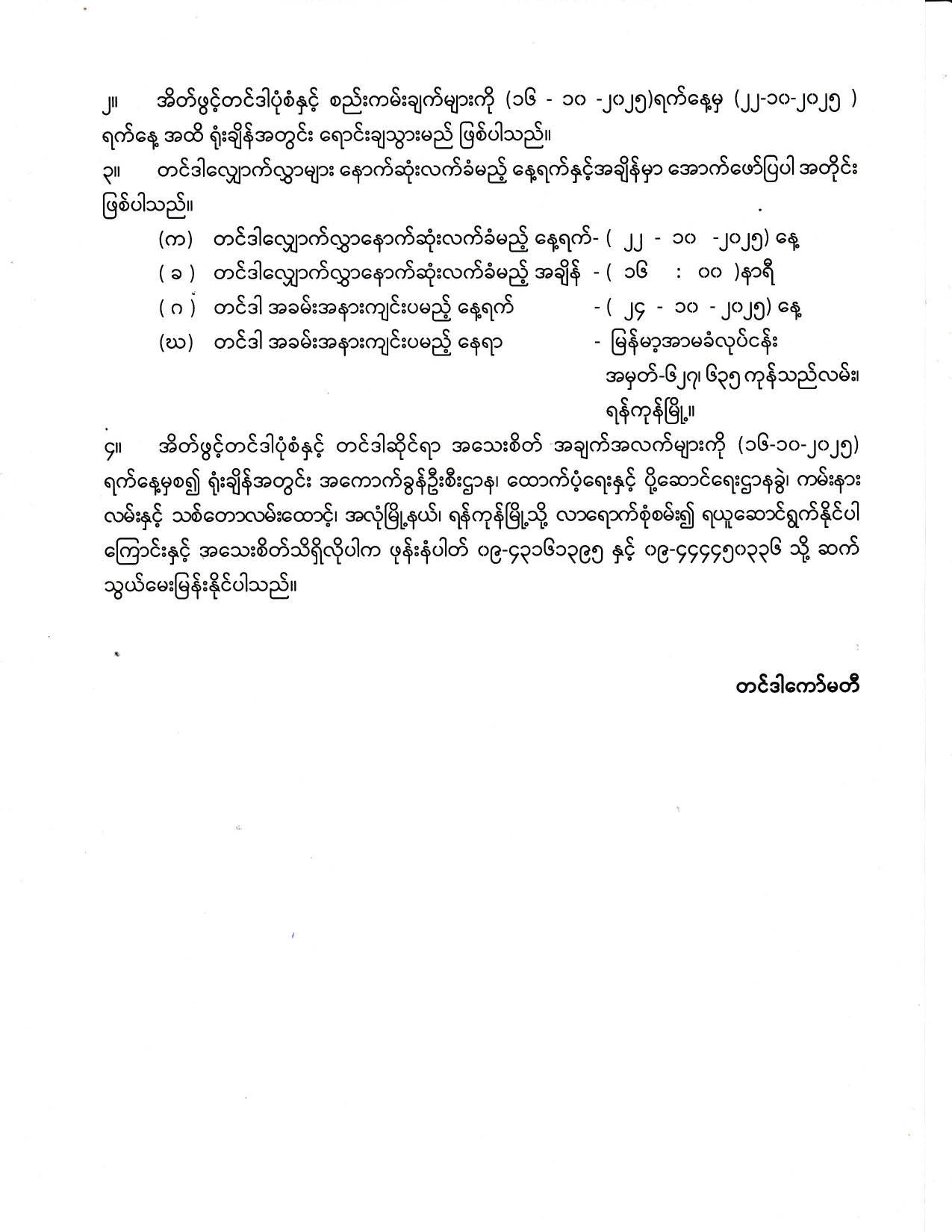 အကောက်ခွန်ဦးစီးဌာနအတွက် အသုံးပြုရန်လိုအပ်သော မီးသတ်ဆေးဘူး၊ ရုံးသုံးစက်ပစ္စည်းများ၊ ကွန်ပျူတာနှင့်ဆက်စပ်ပစ္စည်းများ၊ရုံးသုံးပရိဘောဂများကို အိတ်ဖွင့်တင်ဒါခေါ်ယူခြင်း