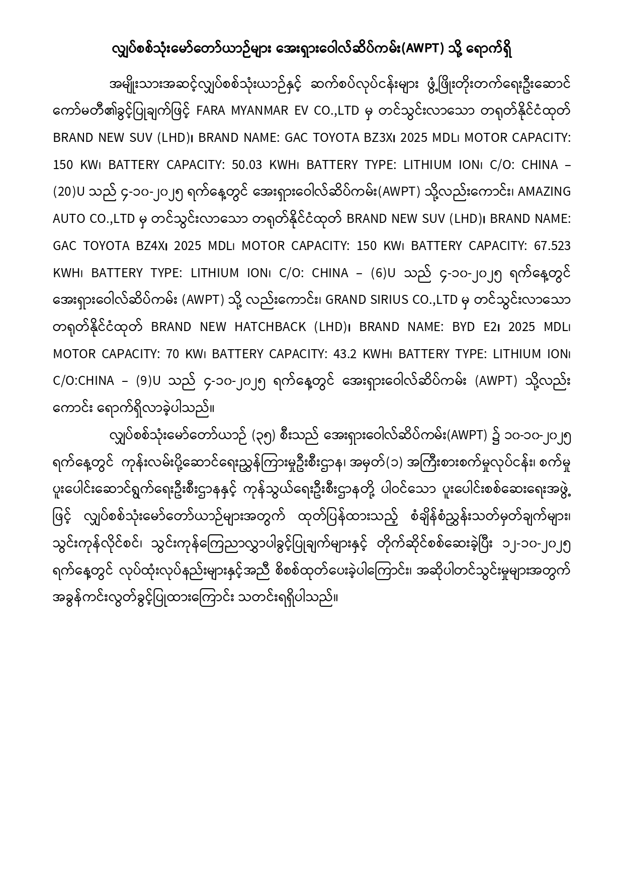လျှပ်စစ်သုံးမော်တော်ယာဉ်များ အေးရှားဝေါလ်ဆိပ်ကမ်း(AWPT) သို့ ရောက်ရှိထုတ်ပေးခဲ့ခြင်း