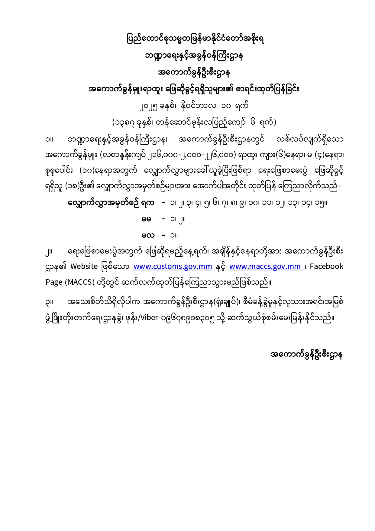 အကောက်ခွန်ဦးစီးဌာန၊ အကောက်ခွန်မှူးရာထူး ဖြေဆိုခွင့်ရရှိသူများ၏ စာရင်းထုတ်ပြန်ခြင်း