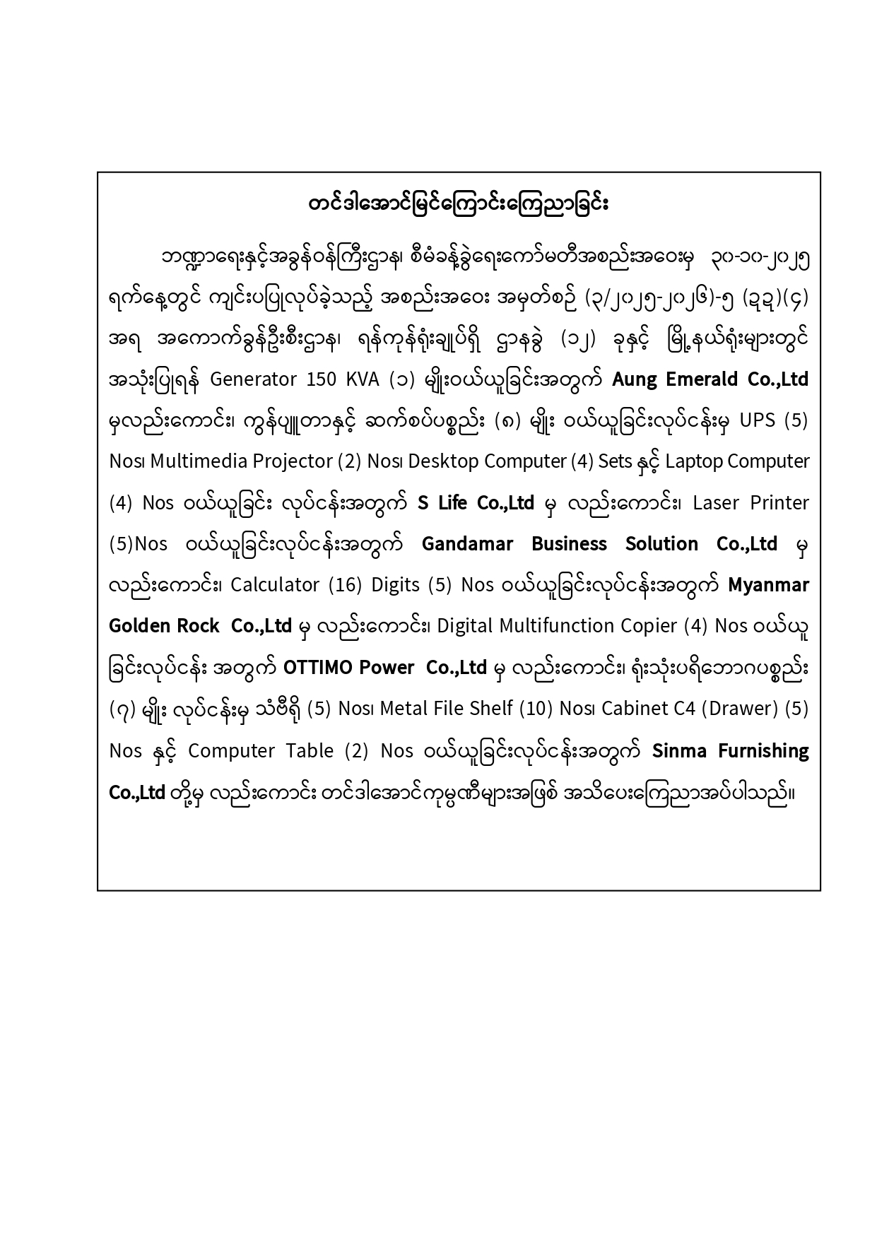 ၂၀၂၅-၂၀၂၆ ဘဏ္ဍာရေးနှစ်အတွက် အကောက်ခွန်ဦးစီးဌာန၊ ရန်ကုန် (ရုံးချုပ်) နှင့် မြို့နယ်ရုံးများတွင် အသုံးပြုရန် မီးသတ်ဆေးဘူး (၁) မျိုး၊ ရုံးသုံးစက်ပစ္စည်း (၄) မျိုး၊ ကွန်ပျူတာနှင့်ဆက်စပ်ပစ္စည်း (၈) မျိုး၊ ရုံးသုံးပရိဘောဂပစ္စည်း (၇) မျိုး ဝယ်ယူခြင်း၊ စုစုပေါင်းလုပ်ငန်း (၅) ခုတို့အတွက် တင်ဒါအောင်မြင်သည့် ကုမ္ပဏီများအား အသိပေးကြေညာခြင်း