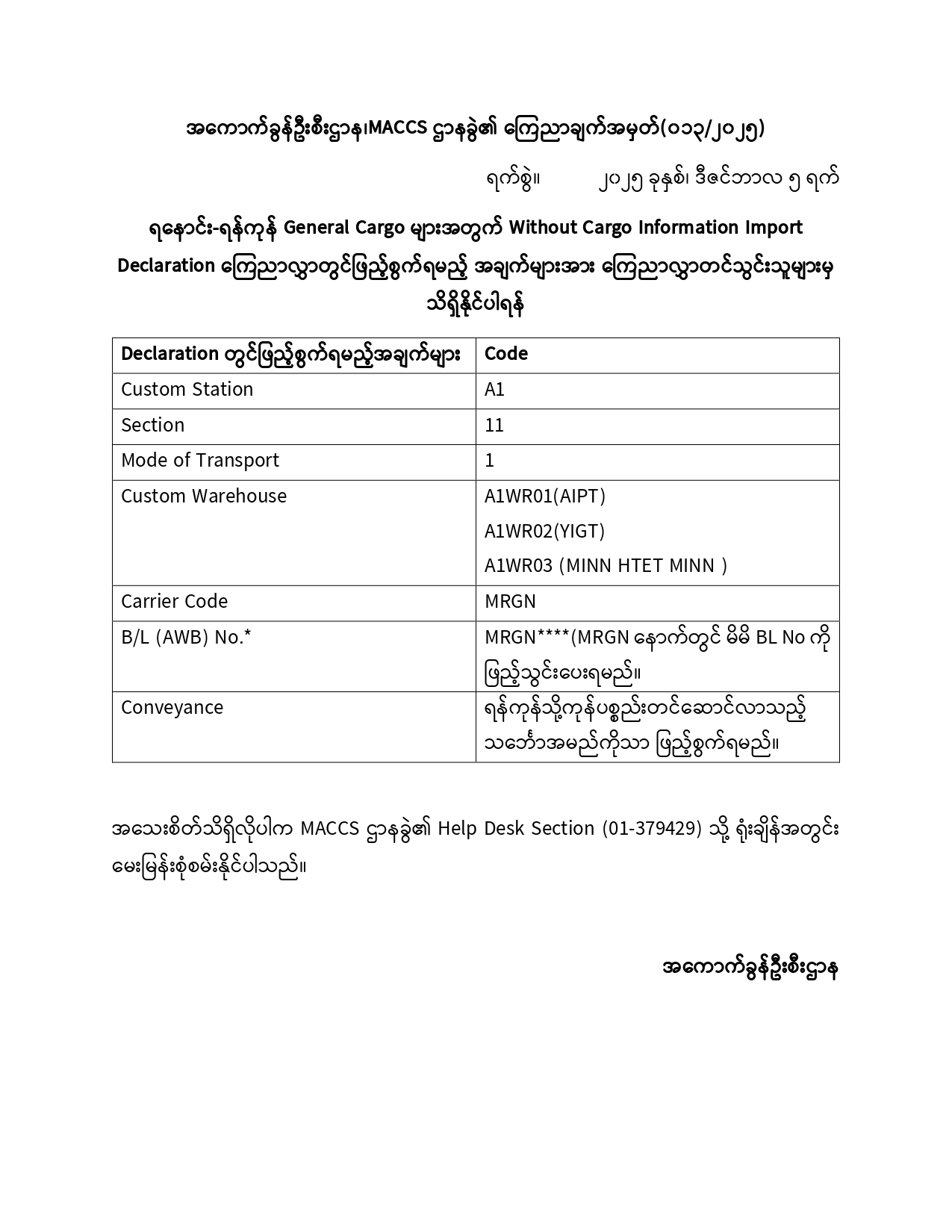 အကောက်ခွန်ဦးစီးဌာန၊ MACCS ဌာနခွဲ၏ကြေညာချက် (၀၁၃/၂၀၂၅)