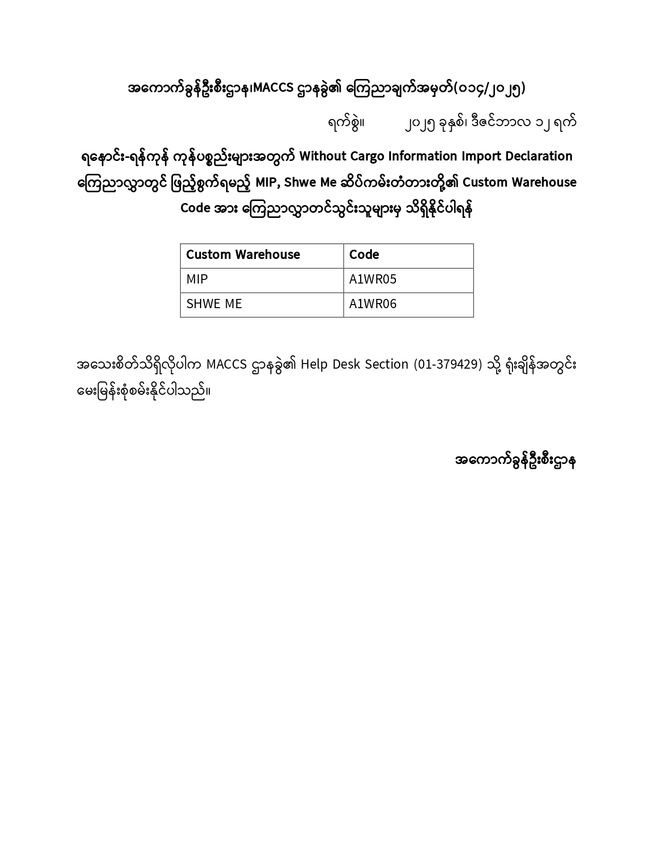 အကောက်ခွန်ဦးစီးဌာန၊ MACCS ဌာနခွဲ၏ ကြေညာချက်အမှတ်(၀၁၄/၂၀၂၅)