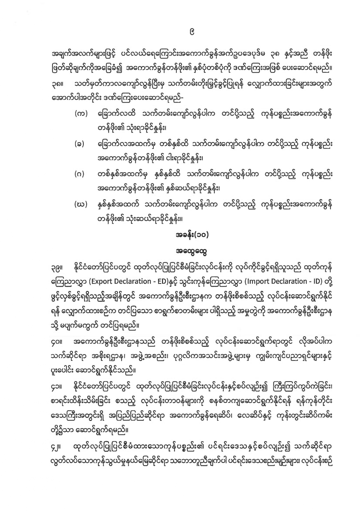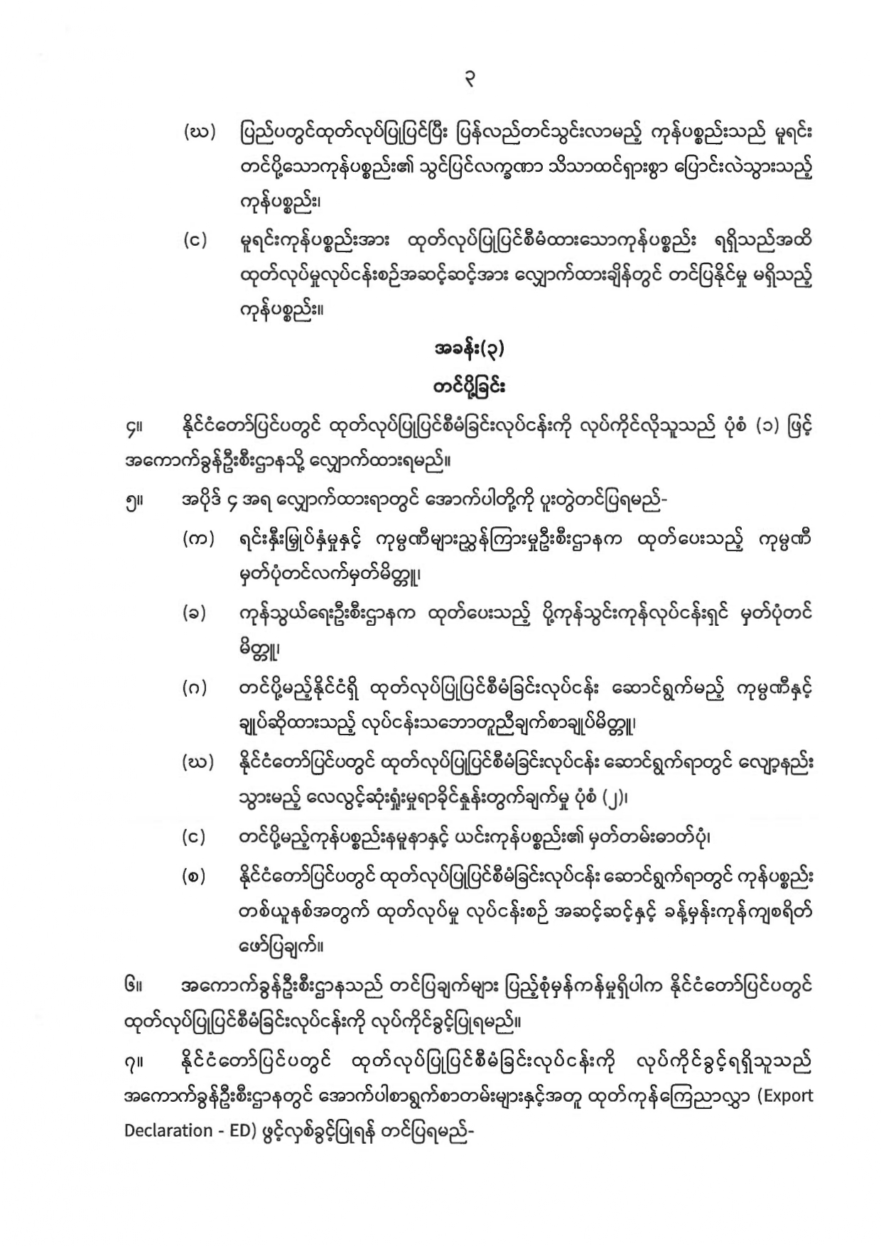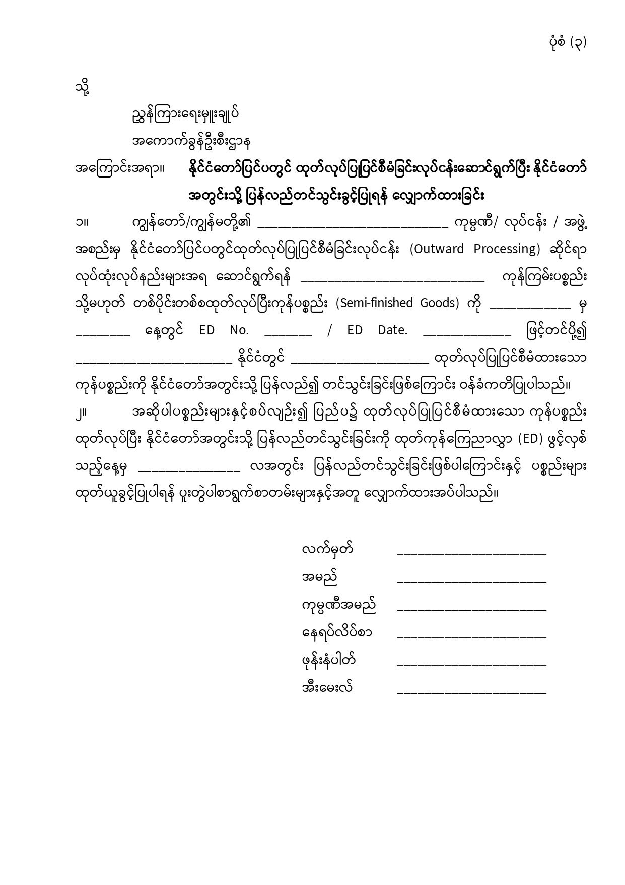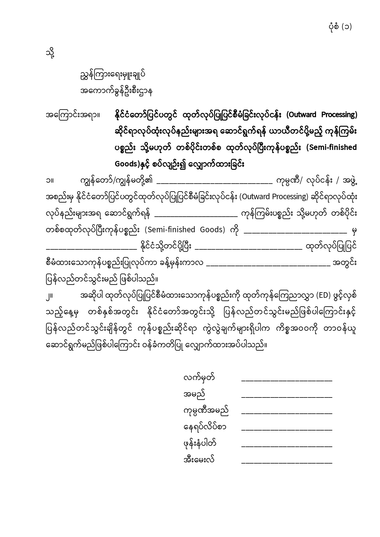 အမိန့်ကြော်ငြာစာအမှတ် (၁၄၃/၂၀၂၅) - နိုင်ငံတော်ပြင်ပတွင် ထုတ်လုပ်ပြုပြင်စီမံခြင်းလုပ်ငန်း(Outward Processing) ဆိုင်ရာလုပ်ထုံးလုပ်နည်းများ