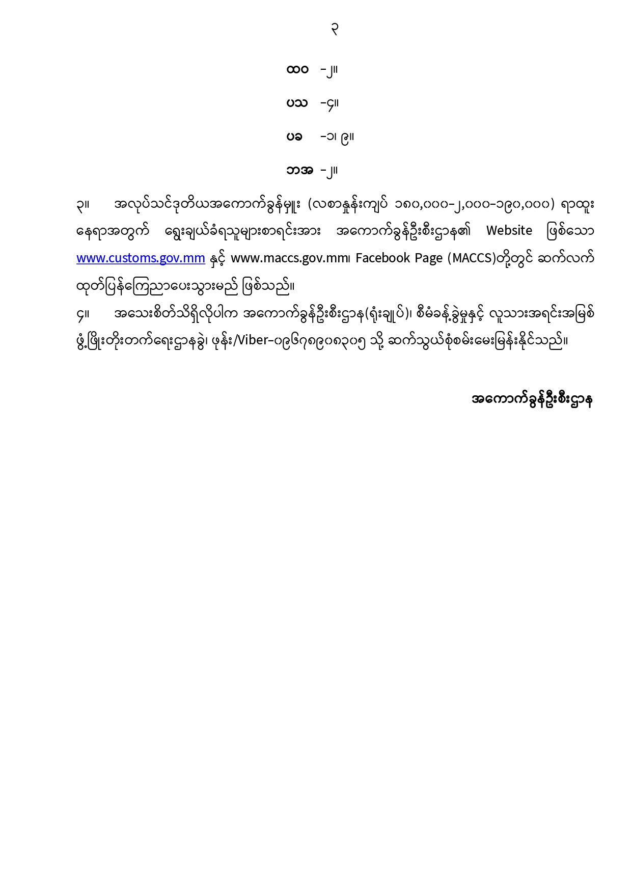 အကောက်ခွန်ဦးစီးဌာန၊ အလုပ်သင်-ဒုအကောက်ခွန်မှူး ရာထူးနေရာများအတွက် လူတွေ့စစ်ဆေးမှုခံယူရမည့်သူများ၏ ခုံအမှတ်များထုတ်ပြန်ခြင်း