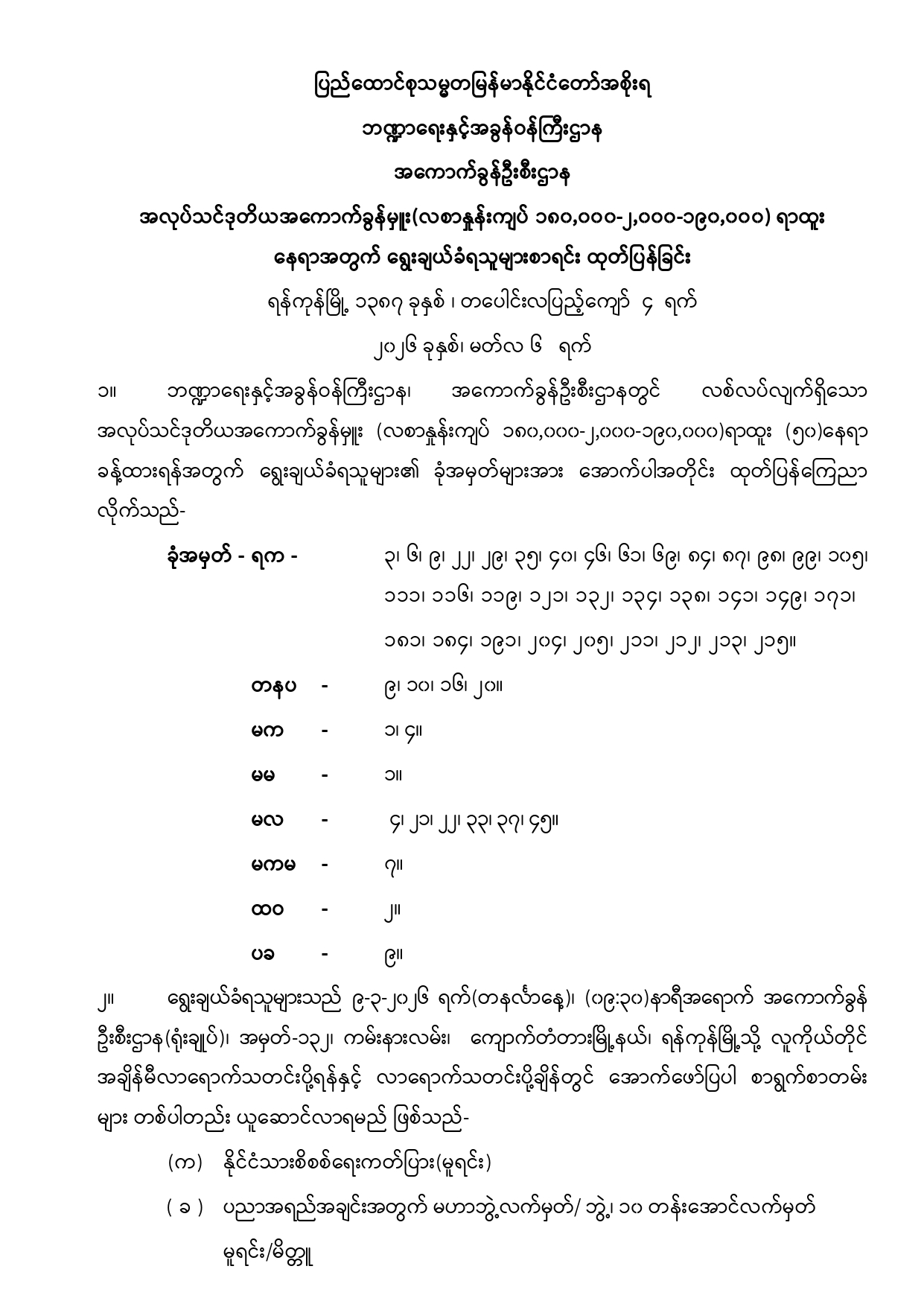 အလုပ်သင်ဒုတိယအကောက်ခွန်မှူး ရာထူးနေရာအတွက် ရွေးချယ်ခံရသူများစာရင်း ထုတ်ပြန်ခြင်း
